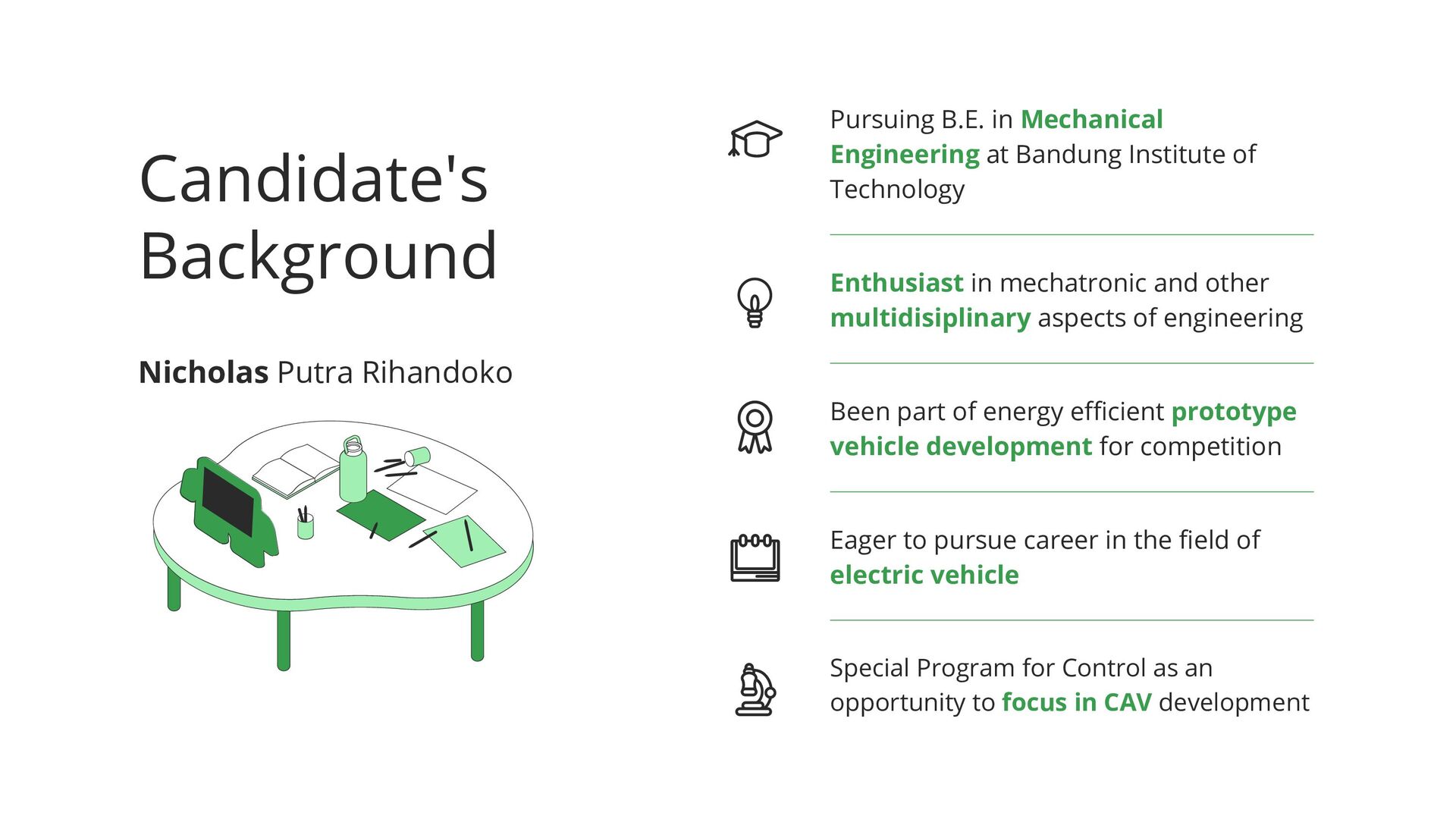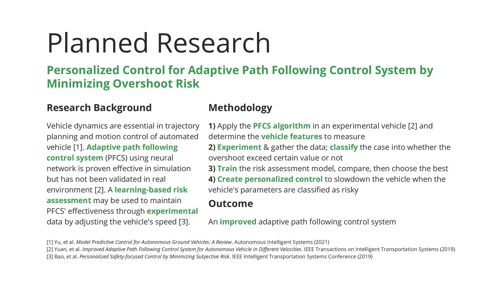 by Minimizing Overshoot Risk Research Background Vehicle dynamics are essential in trajectory planning and motion control of automated vehicle [1]. Adaptive path following control system (PFCS) using neural network is proven effective in simulation but has not been validated in real environment [2]. A learning-based risk assessment may be used to maintain PFCS' effectiveness through experimental data by adjusting the vehicle's speed [3]. [1] Yu, et al. Model Predictive Control for Autonomous Ground Vehicles: A Review. Autonomous Intelligent Systems (2021) [2] Yuan, et al. Improved Adaptive Path Following Control System for Autonomous Vehicle in Different Velocities. IEEE Transactions on Intelligent Transportation Systems (2019) [3] Bao, et al. Personalized Safety-focused Control by Minimizing Subjective Risk. IEEE Intelligent Transportation Systems Conference (2019) Methodology 1) Apply the PFCS algorithm in an experimental vehicle [2] and determine the vehicle features to measure 2) Experiment & gather the data; classify the case into whether the overshoot exceed certain value or not 3) Train the risk assessment model, compare, then choose the best 4) Create personalized control to slowdown the vehicle when the vehicle's parameters are classified as risky Outcome An improved adaptive path following control system