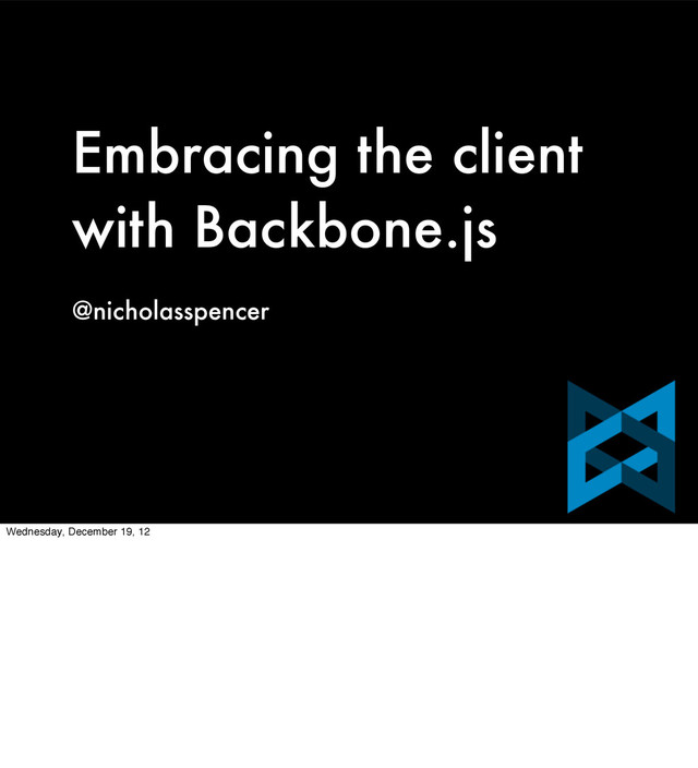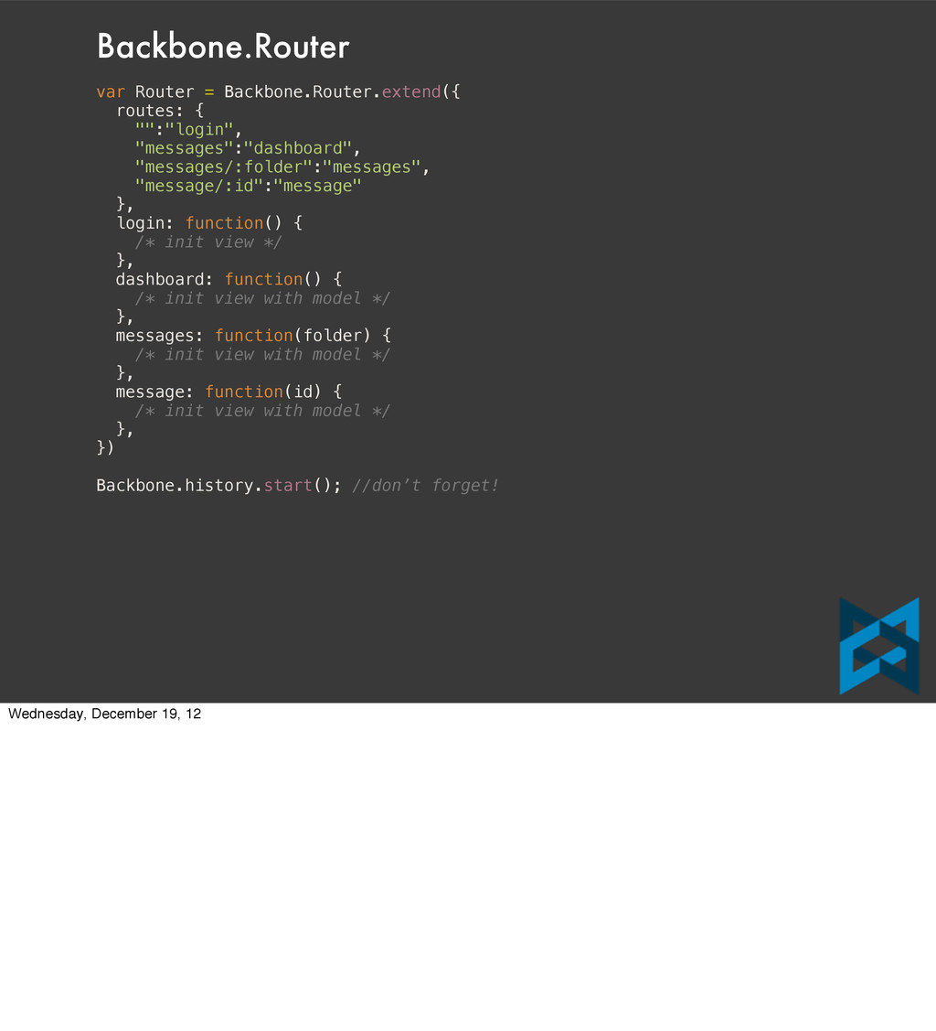 "Doe" }, initialize: function() { //setup code }, isAnonymous: function() { //sorry to all the real John Does out there return (this.get("firstName")==="John"&&this.get("lastName")==="Doe") } }); var user = new User({ firstName: "Nicholas", lastName: "Spencer" }); user.isAnonymous(); // false Wednesday, December 19, 12
