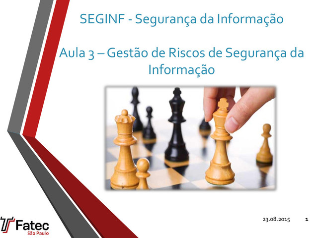 de medidas que busquem o equilíbrio entre riscos e custos. • Segundo o ISO/IEC Guide 73* Risco é a combinação da probabilidade de um evento e de seus impacto (consequências). R = P X I • Geralmente, o termo “risco” é utilizado em segurança apenas quando há a possibilidade de consequências negativas. *Gestão de riscos -Vocabulário - Recomendações para uso em normas 23.08.2015 5 Custo Risco Segurança Ideal Custo de tratar o risco X Custo de um Incidente