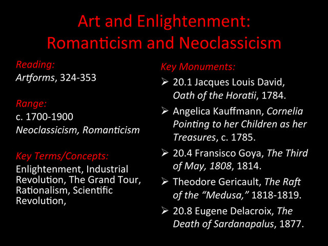 Ar,orms, 324-‐353 Range: c. 1700-‐1900 Neoclassicism, Roman4cism Key Terms/Concepts: Enlightenment, Industrial Revolu2on, The Grand Tour, Ra2onalism, Scien2fic Revolu2on, Key Monuments: 20.1 Jacques Louis David, Oath of the Hora4i, 1784. Angelica Kauffmann, Cornelia Poin4ng to her Children as her Treasures, c. 1785. 20.4 Fransisco Goya, The Third of May, 1808, 1814. Theodore Gericault, The RaF of the “Medusa,” 1818-‐1819. 20.8 Eugene Delacroix, The Death of Sardanapalus, 1877.