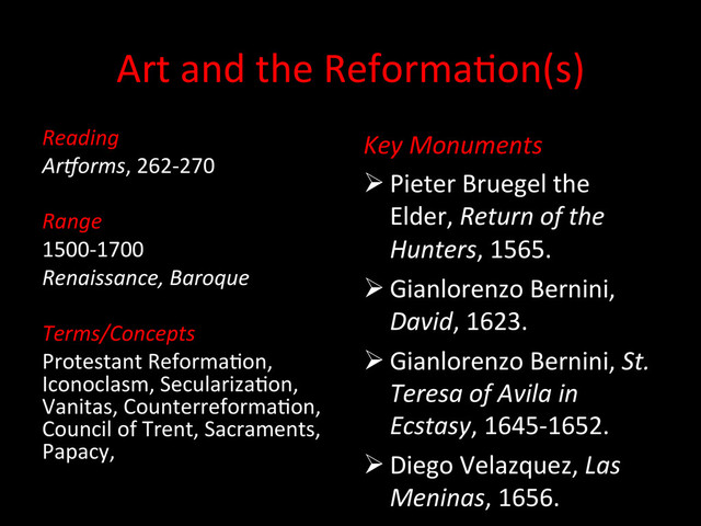 Range 1500-‐1700 Renaissance, Baroque Terms/Concepts Protestant Reforma.on, Iconoclasm, Seculariza.on, Vanitas, Counterreforma.on, Council of Trent, Sacraments, Papacy, Key Monuments Pieter Bruegel the Elder, Return of the Hunters, 1565. Gianlorenzo Bernini, David, 1623. Gianlorenzo Bernini, St. Teresa of Avila in Ecstasy, 1645-‐1652. Diego Velazquez, Las Meninas, 1656.