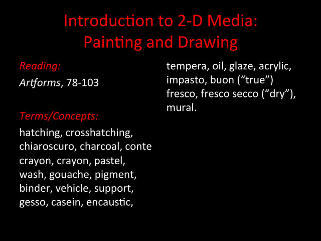 Reading: Ar,orms, 78-‐103 Terms/Concepts: hatching, crosshatching, chiaroscuro, charcoal, conte crayon, crayon, pastel, wash, gouache, pigment, binder, vehicle, support, gesso, casein, encaus)c, tempera, oil, glaze, acrylic, impasto, buon (“true”) fresco, fresco secco (“dry”), mural.