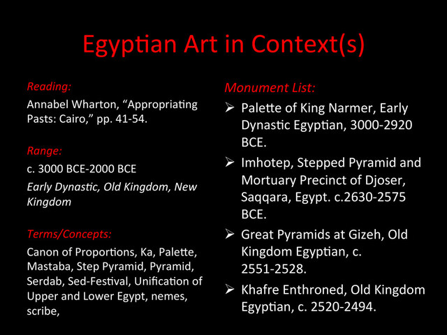 “Appropria%ng Pasts: Cairo,” pp. 41-‐54. Range: c. 3000 BCE-‐2000 BCE Early Dynas0c, Old Kingdom, New Kingdom Terms/Concepts: Canon of Propor%ons, Ka, PaleIe, Mastaba, Step Pyramid, Pyramid, Serdab, Sed-‐Fes%val, Unifica%on of Upper and Lower Egypt, nemes, scribe, Monument List: PaleIe of King Narmer, Early Dynas%c Egyp%an, 3000-‐2920 BCE. Imhotep, Stepped Pyramid and Mortuary Precinct of Djoser, Saqqara, Egypt. c.2630-‐2575 BCE. Great Pyramids at Gizeh, Old Kingdom Egyp%an, c. 2551-‐2528. Khafre Enthroned, Old Kingdom Egyp%an, c. 2520-‐2494.