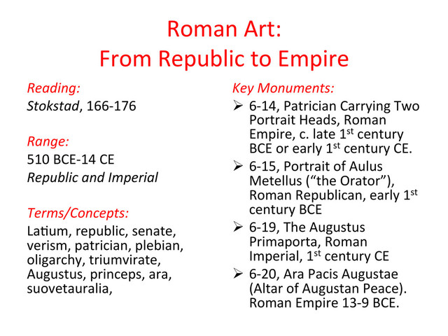 Stokstad, 166-‐176 Range: 510 BCE-‐14 CE Republic and Imperial Terms/Concepts: La?um, republic, senate, verism, patrician, plebian, oligarchy, triumvirate, Augustus, princeps, ara, suovetauralia, Key Monuments: 6-‐14, Patrician Carrying Two Portrait Heads, Roman Empire, c. late 1st century BCE or early 1st century CE. 6-‐15, Portrait of Aulus Metellus (“the Orator”), Roman Republican, early 1st century BCE 6-‐19, The Augustus Primaporta, Roman Imperial, 1st century CE 6-‐20, Ara Pacis Augustae (Altar of Augustan Peace). Roman Empire 13-‐9 BCE.