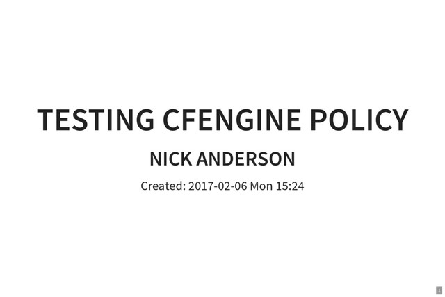 particular order: Behind the scenes: How do we test CFEngine Test dummies on sale! Policy testing using TAP Testing CFEngine policy by counting classes CFEngine Policy Servers with Docker Using Vagrant with CFEngine for Development and Testing CFEngine Enterprise Vagrant Environment Vagrant: Virtual machine provisioning made easy