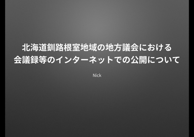 このスライドは北海道釧路及び根室地方の各地方議会の会議録と議会広報誌について、インターネット上で公開されているか、公開されている場合どれくらい最新のものを掲載しているかをまとめたものです。 (手動によるチェックなので見落としなどあるかもしれません。間違い等ございましたらご指摘頂ければ幸いです。)