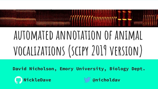 annotation of vocalizations Development on Github • https://github.com/yardencsGitHub/tweetynet • https://github.com/NickleDave/vak • https://crowsetta.readthedocs.io/en/latest/ Next version out in time for Neuroscience 2019 in Chicago!