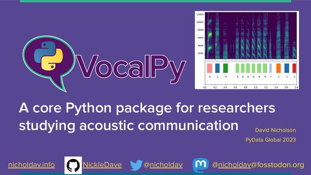 Features: • Data types • Works with a wide variety of formats • Classes for common steps in workflows • Designed for reproducibility • Allows scientist-coders to interactively build datasets then share as a database VocalPy