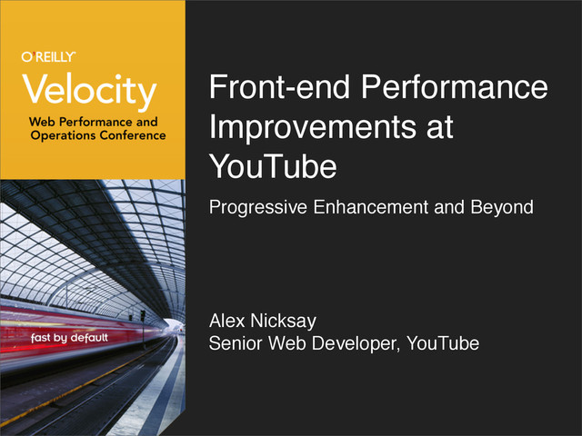 Over the past year, we've made many front-end performance improvements to the YouTube Watch page, using techniques such as progressive enhancement, a behavior-based widget system, and preloaded connections. I'll discuss how we utilize each technique at YouTube and how you can apply them to your own site.