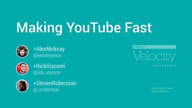 In this talk, we’re going to present some of the projects we’ve been working on to speed up your viewing experience. In particular, we’ll introduce SPF (spfjs), a new HTML5 JS framework that now forms the foundation of YouTube navigation, and discuss the challenges of integrating that with an aggressive, bandwidth-hungry HTML5 video player.