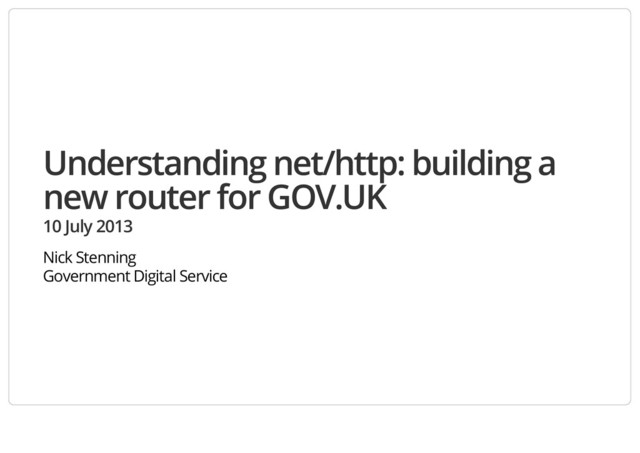 work, with no attempt at optimization. Contributing factors in Go's effectiveness: Dealing with error conditions up front The defer, recover() pattern Interfaces (is a bare pointer really the right answer?) Composition of simple components (Trie, TrieMux, Router) Rich standard library