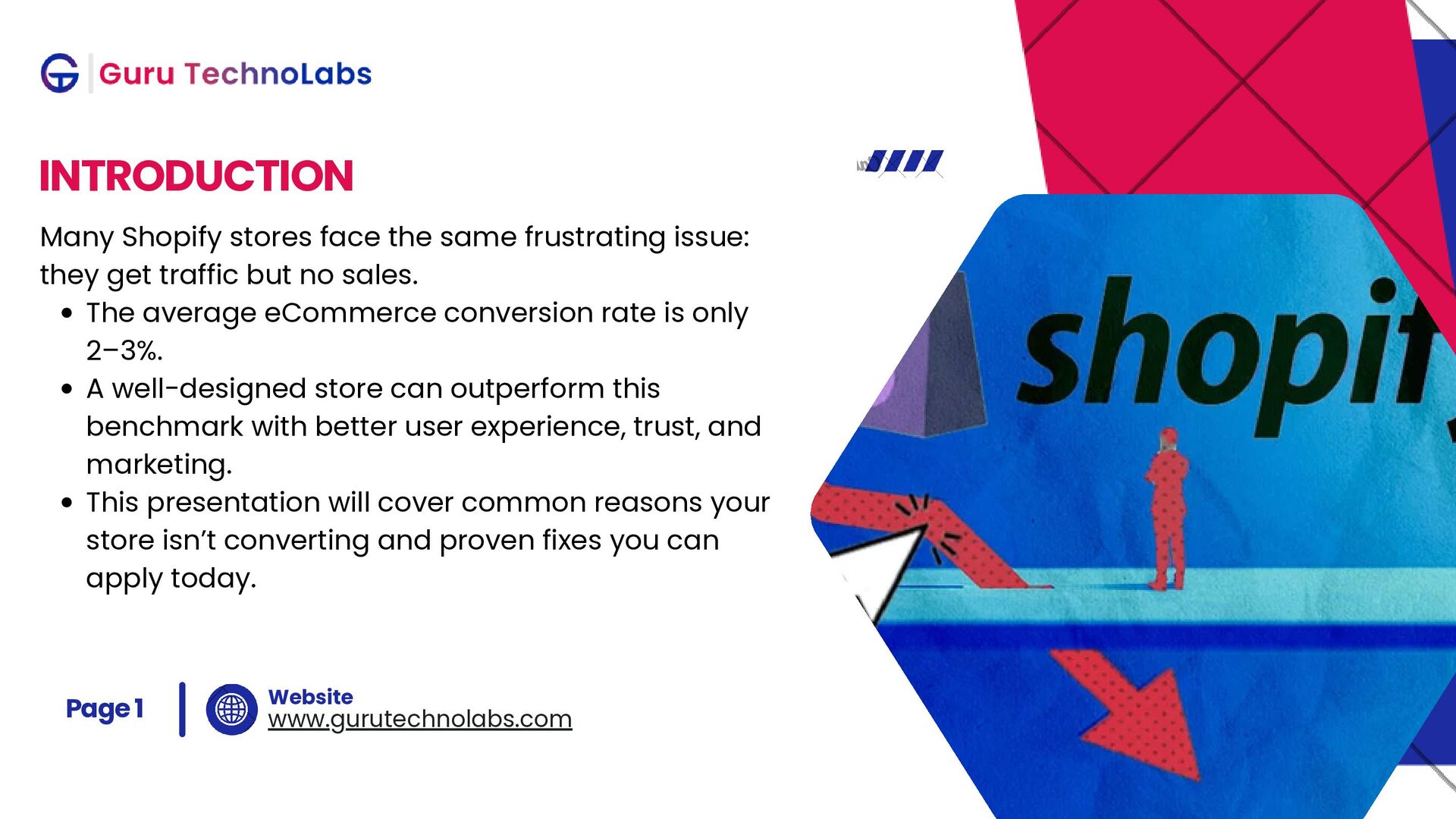 frustrating issue: they get traffic but no sales. The average eCommerce conversion rate is only 2–3%. A well-designed store can outperform this benchmark with better user experience, trust, and marketing. This presentation will cover common reasons your store isn’t converting and proven fixes you can apply today. INTRODUCTION