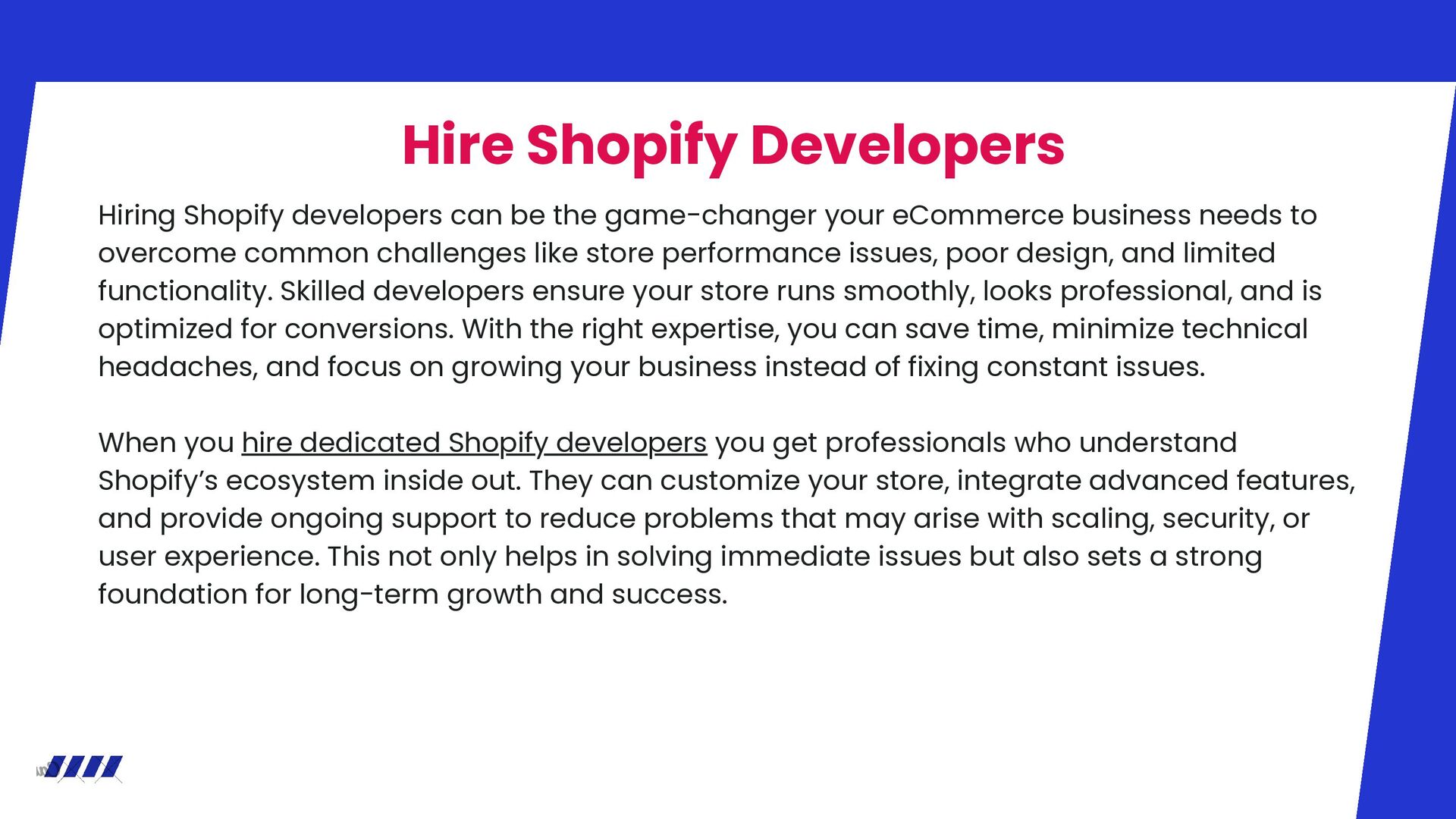 can be the game-changer your eCommerce business needs to overcome common challenges like store performance issues, poor design, and limited functionality. Skilled developers ensure your store runs smoothly, looks professional, and is optimized for conversions. With the right expertise, you can save time, minimize technical headaches, and focus on growing your business instead of fixing constant issues. When you hire dedicated Shopify developers you get professionals who understand Shopify’s ecosystem inside out. They can customize your store, integrate advanced features, and provide ongoing support to reduce problems that may arise with scaling, security, or user experience. This not only helps in solving immediate issues but also sets a strong foundation for long-term growth and success.