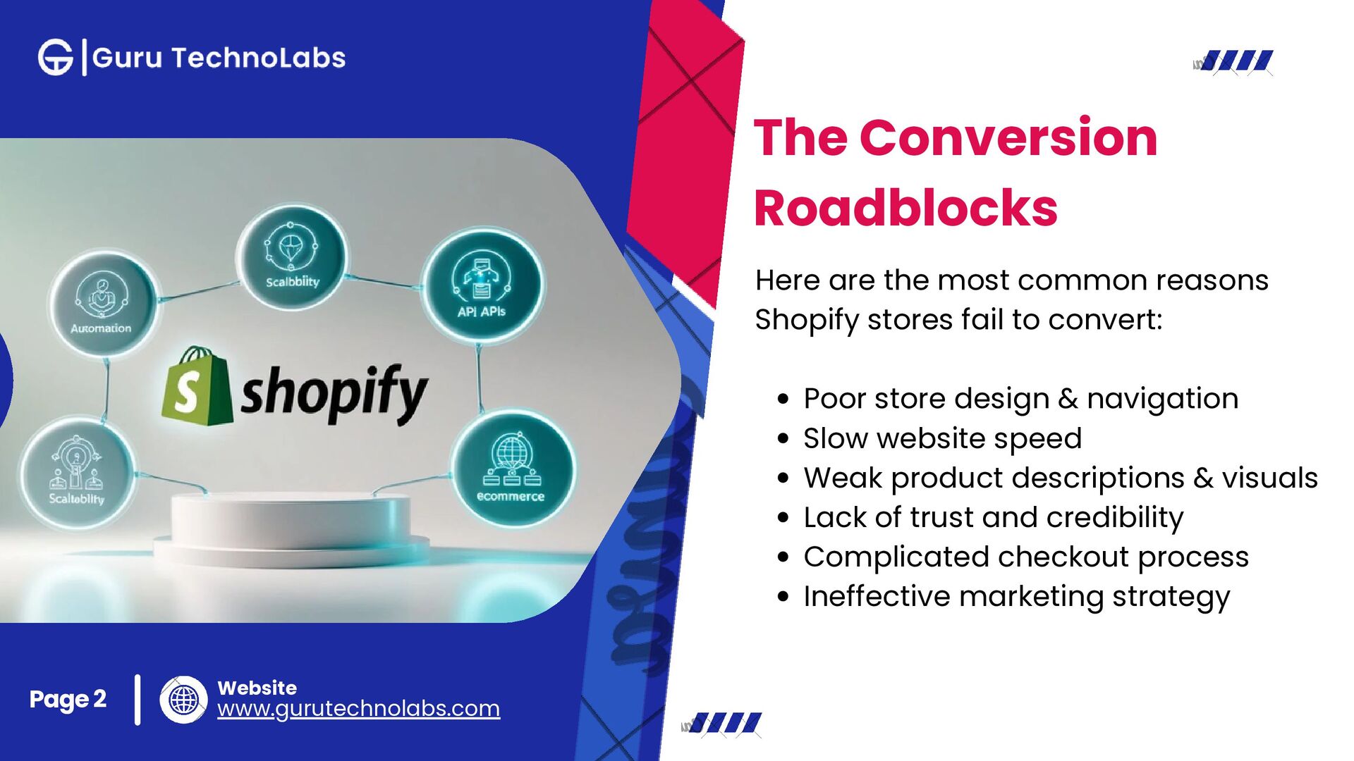 most common reasons Shopify stores fail to convert: Poor store design & navigation Slow website speed Weak product descriptions & visuals Lack of trust and credibility Complicated checkout process Ineffective marketing strategy