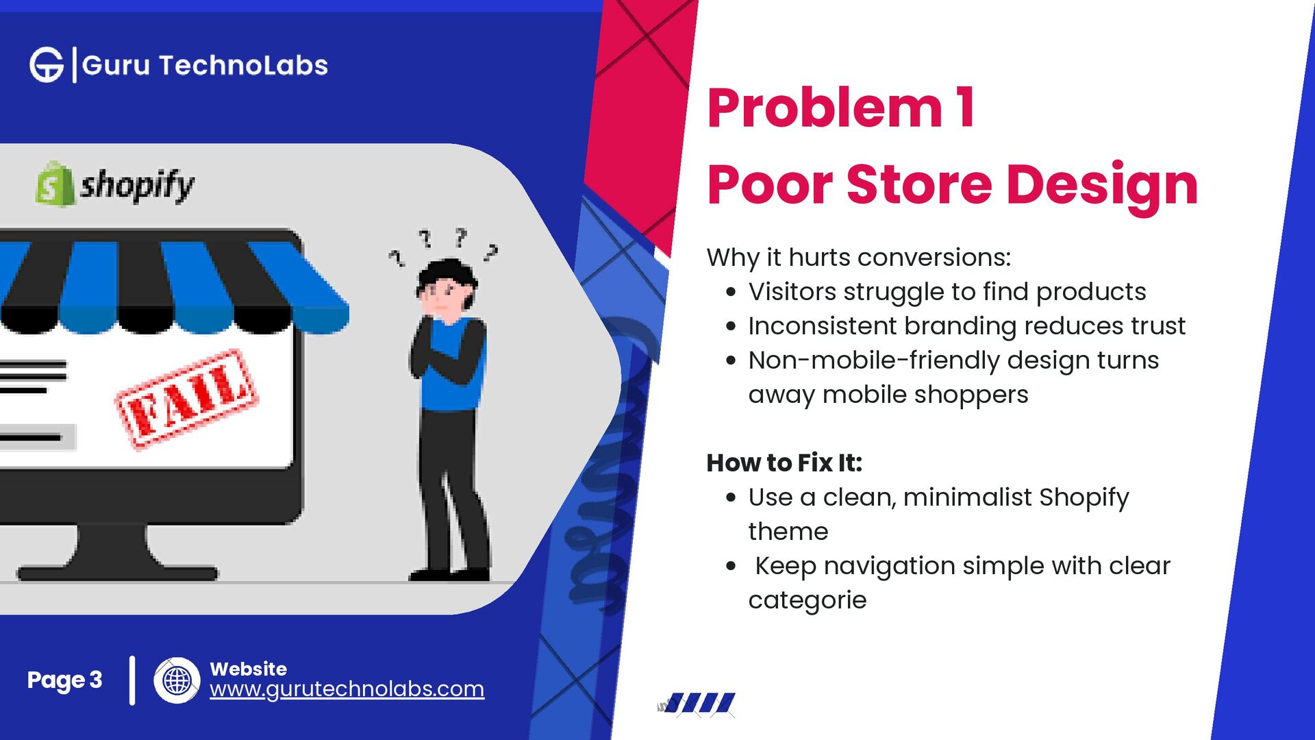 struggle to find products Inconsistent branding reduces trust Non-mobile-friendly design turns away mobile shoppers How to Fix It: Use a clean, minimalist Shopify theme Keep navigation simple with clear categorie Page 3 www.gurutechnolabs.com Website