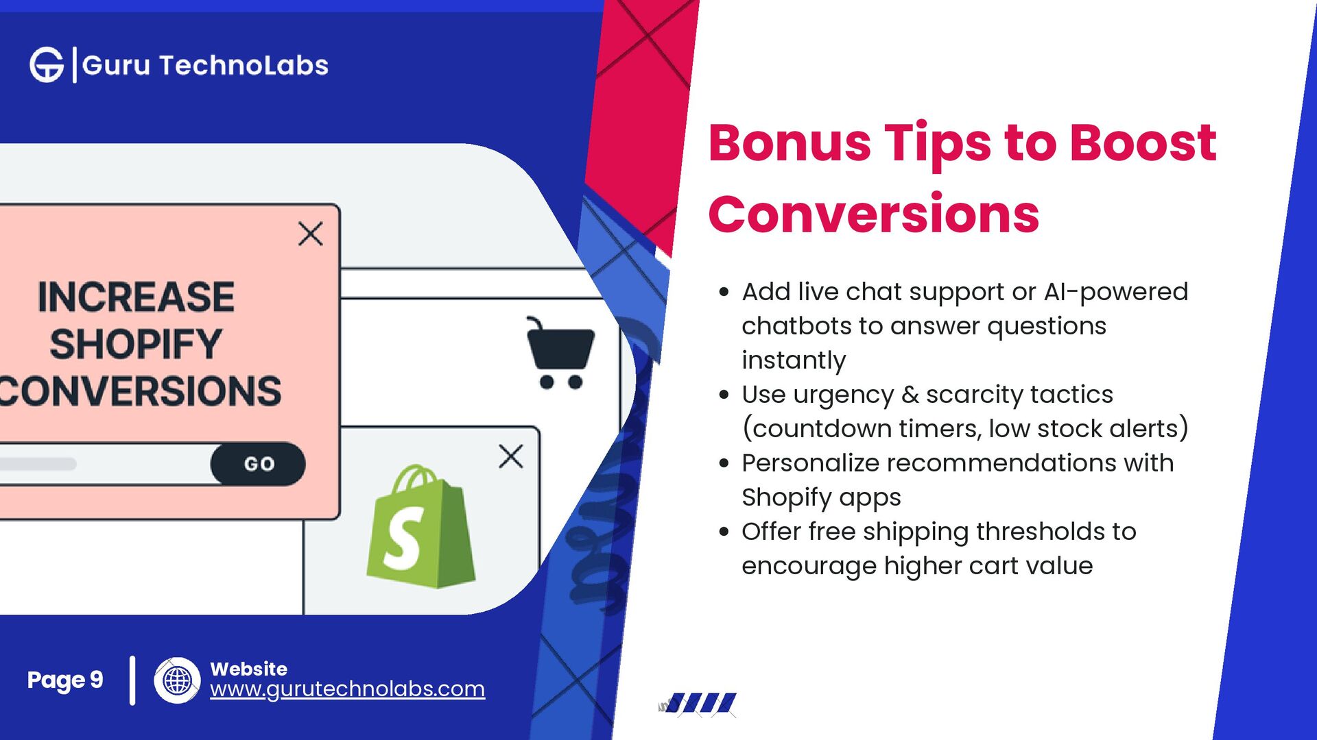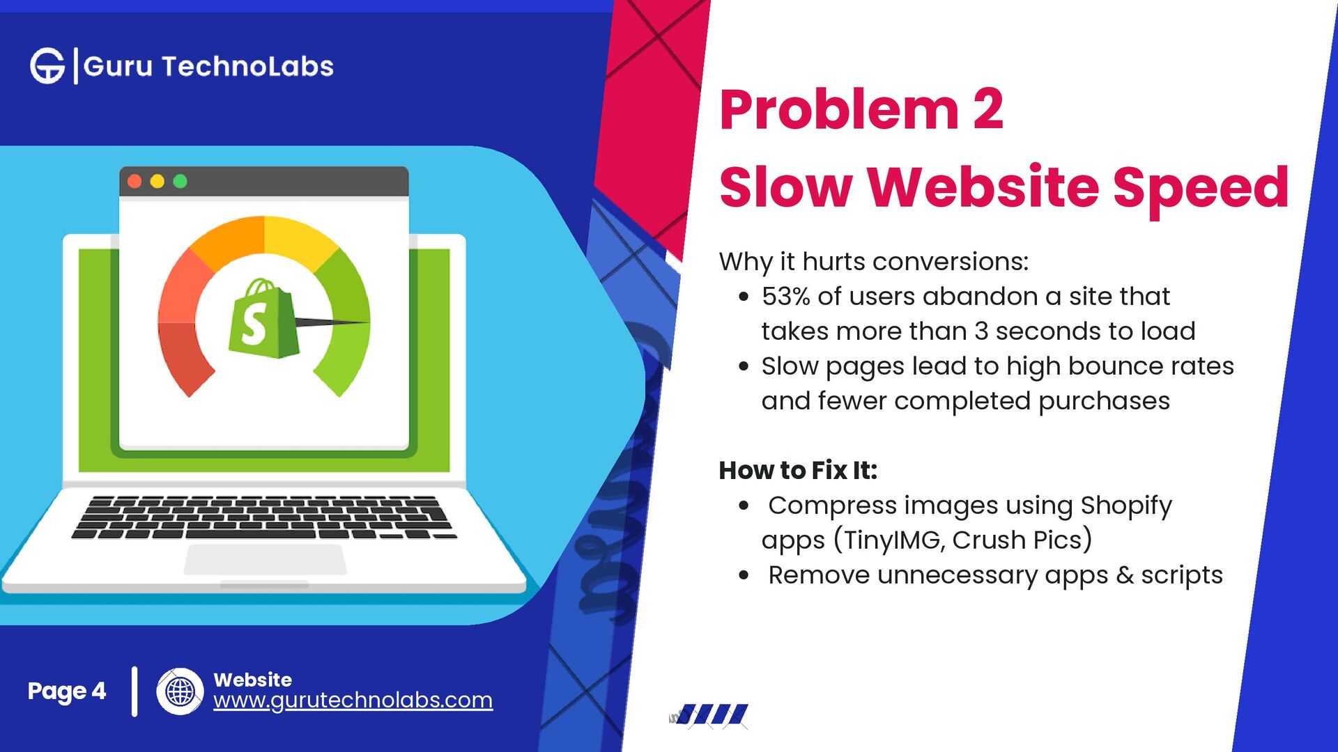 of users abandon a site that takes more than 3 seconds to load Slow pages lead to high bounce rates and fewer completed purchases How to Fix It: Compress images using Shopify apps (TinyIMG, Crush Pics) Remove unnecessary apps & scripts Page 4 www.gurutechnolabs.com Website