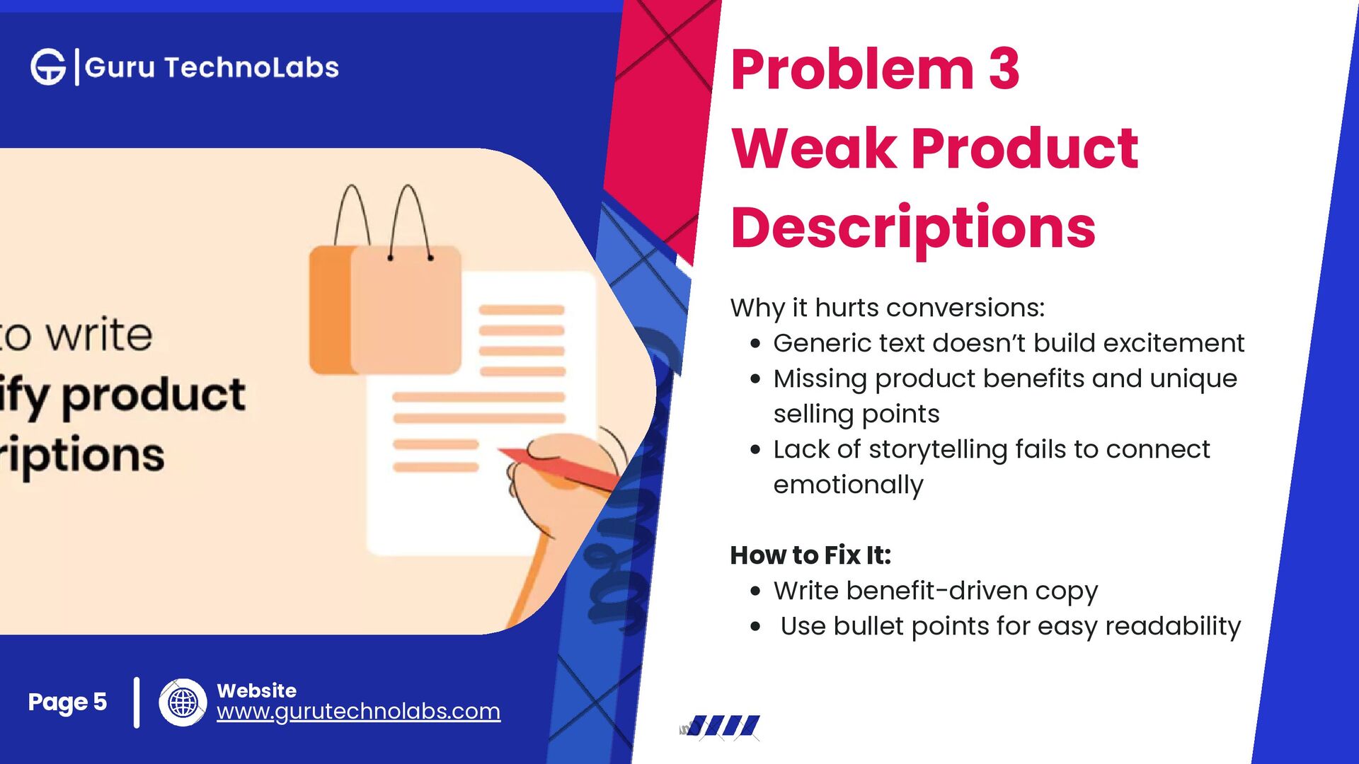 text doesn’t build excitement Missing product benefits and unique selling points Lack of storytelling fails to connect emotionally How to Fix It: Write benefit-driven copy Use bullet points for easy readability Page 5 www.gurutechnolabs.com Website