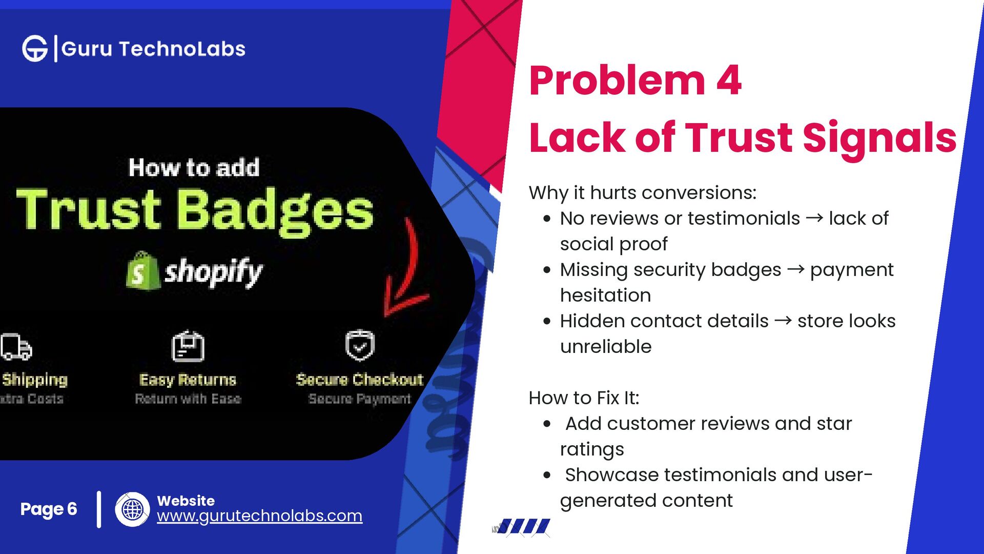 No reviews or testimonials → lack of social proof Missing security badges → payment hesitation Hidden contact details → store looks unreliable How to Fix It: Add customer reviews and star ratings Showcase testimonials and user- generated content Page 6 www.gurutechnolabs.com Website