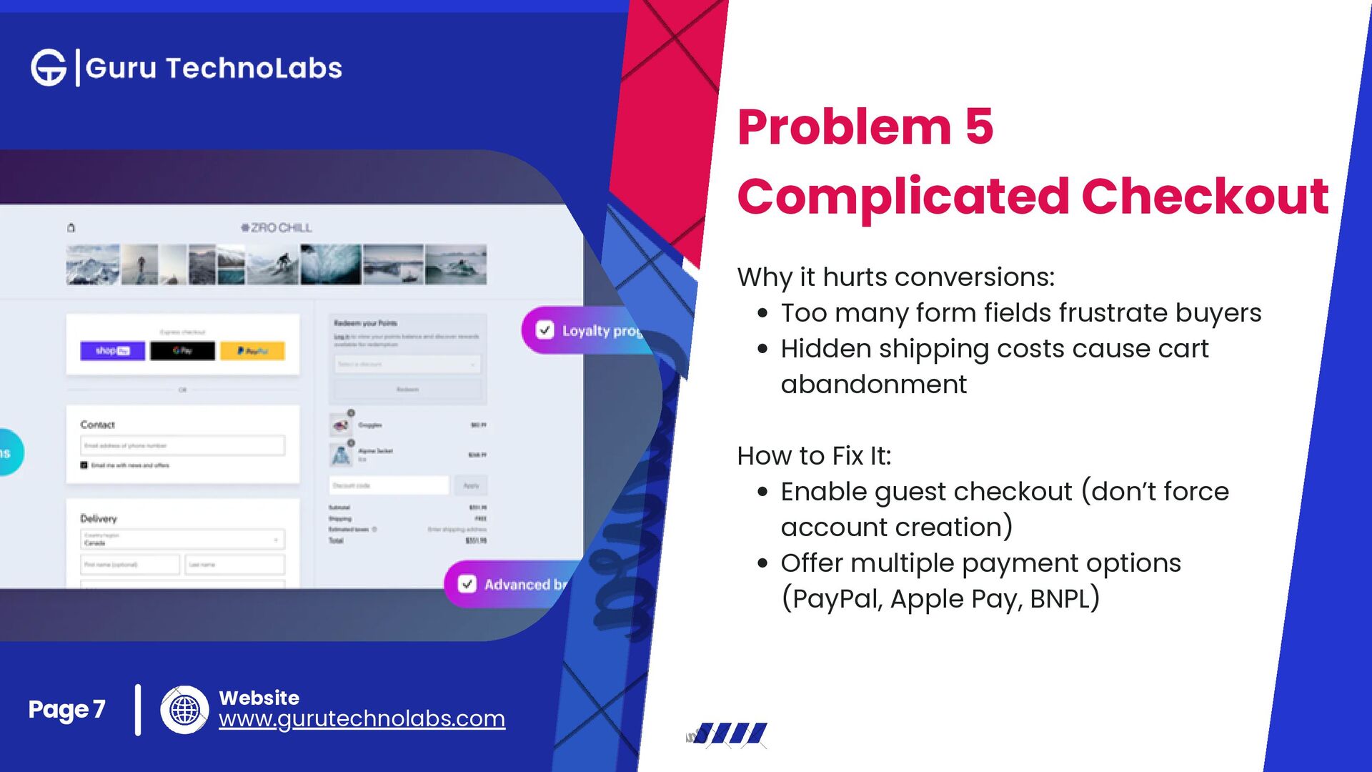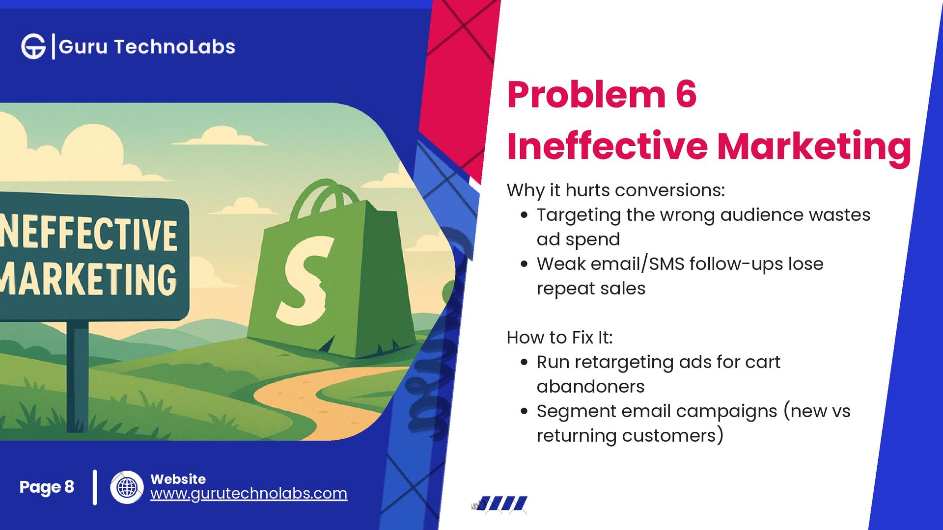 spend Weak email/SMS follow-ups lose repeat sales How to Fix It: Run retargeting ads for cart abandoners Segment email campaigns (new vs returning customers) Page 8 www.gurutechnolabs.com Website Problem 6 Ineffective Marketing