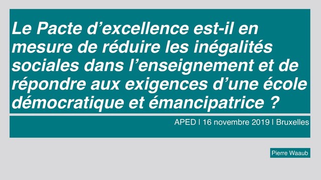 et les moins favorisés (ISE) Réduire le redoublement et le décrochage Réduire les changements d’école au sein du tronc commun Différenciation dans la classe Evaluation formative Accompagnement personnalisé Meilleure prise en compte des difficultés scolaires dès la maternelle Améliorer les savoirs et compétences des élèves Augmenter la part des diplômés de l’enseignement secondaire supérieur Enjeu: l’efficacité comme conséquence de l’équité?