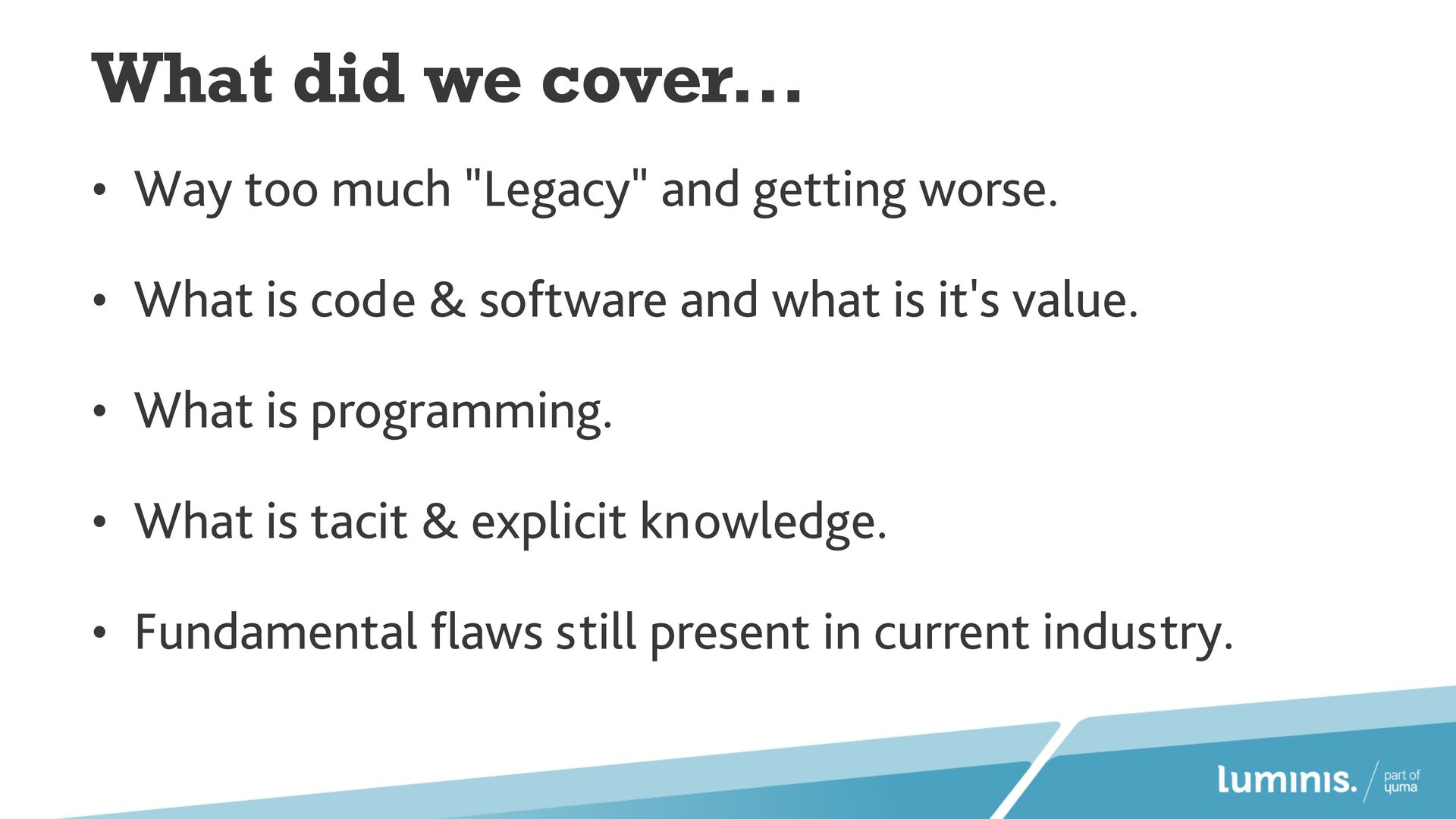 getting worse. • What is code & software and what is it's value. • What is programming. • What is tacit & explicit knowledge. • Fundamental flaws still present in current industry.