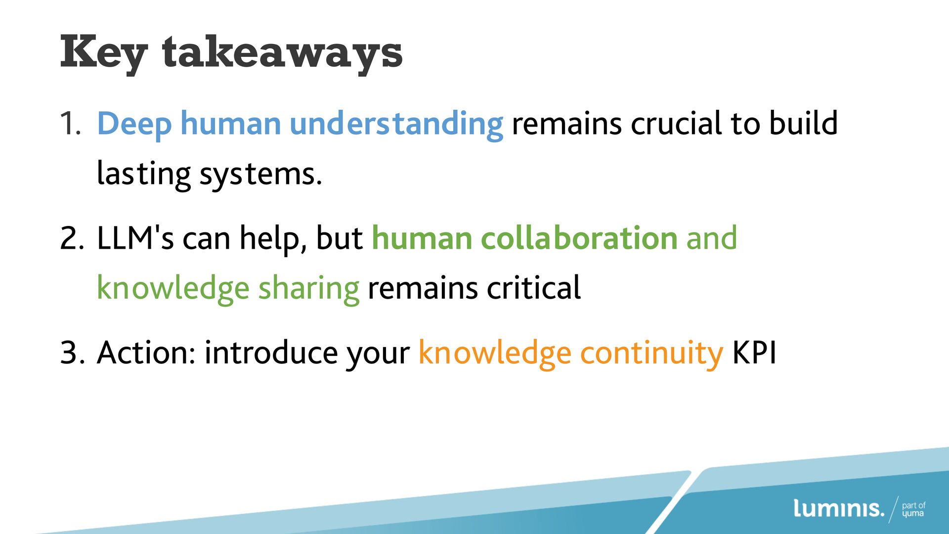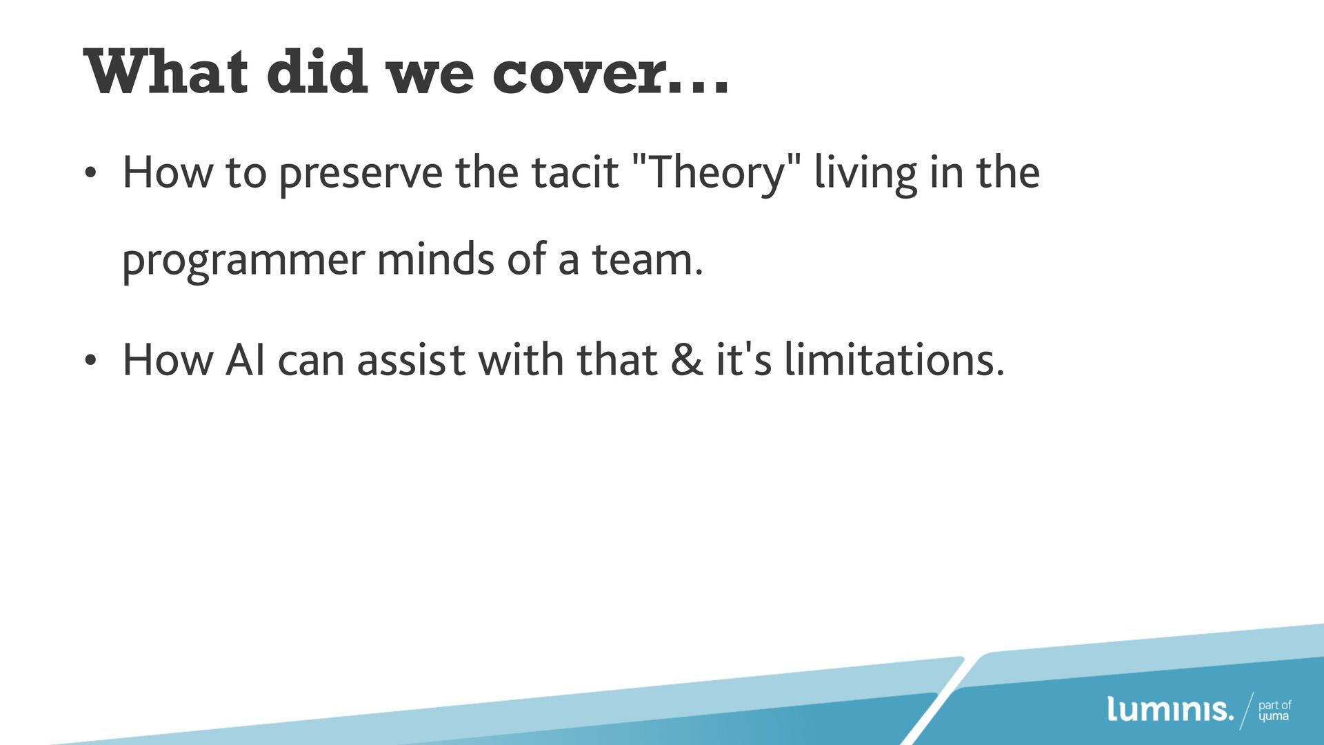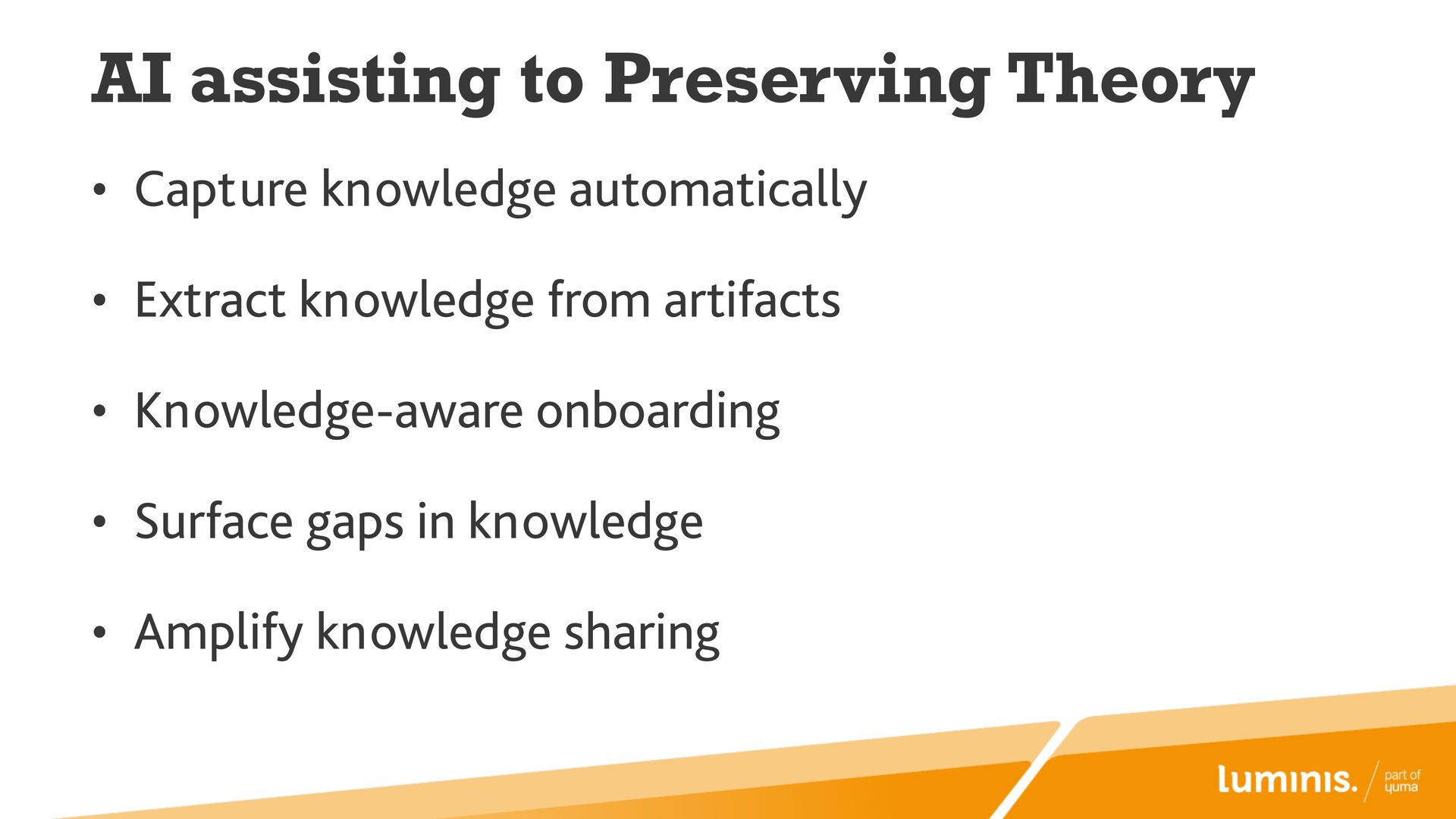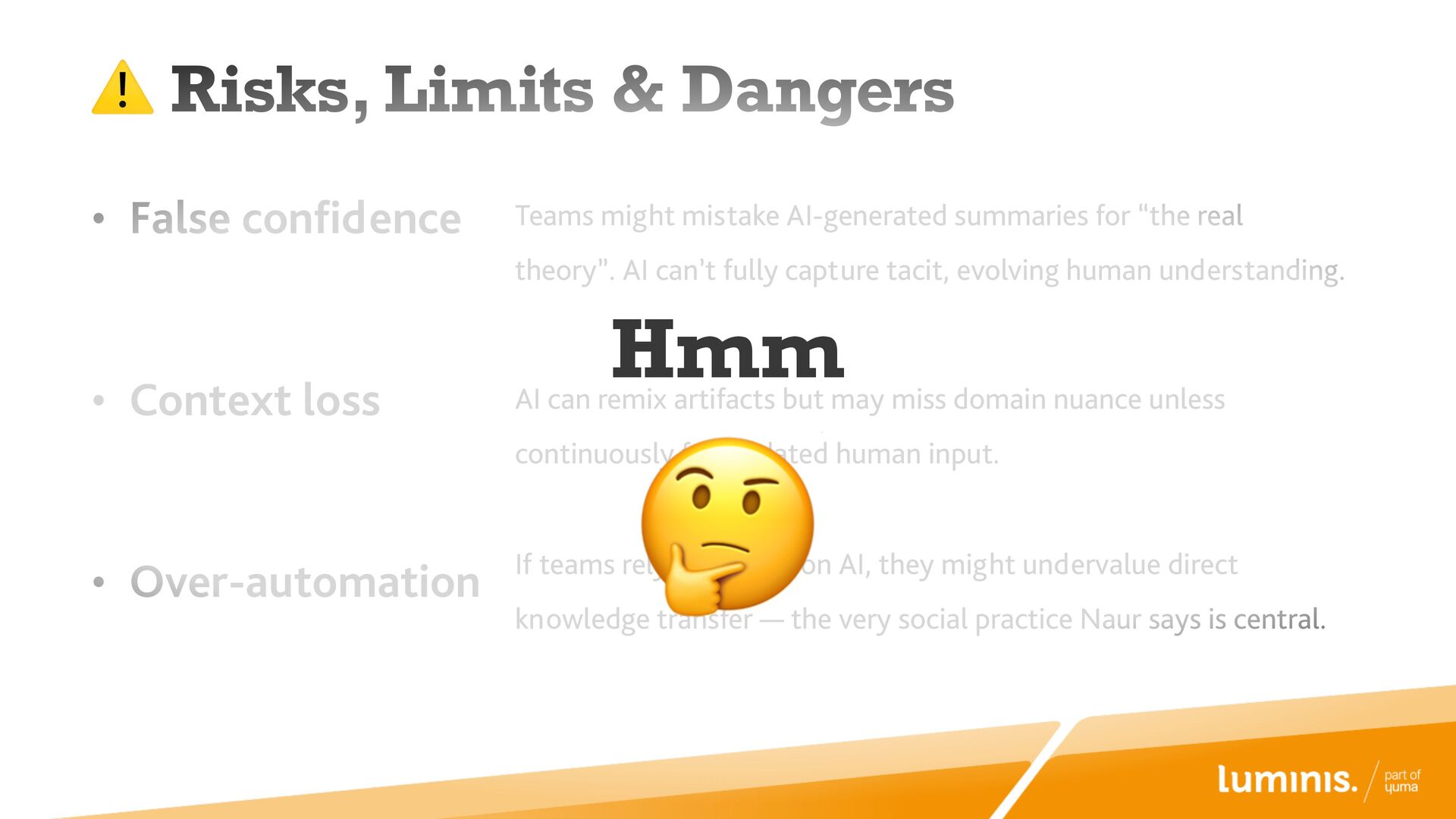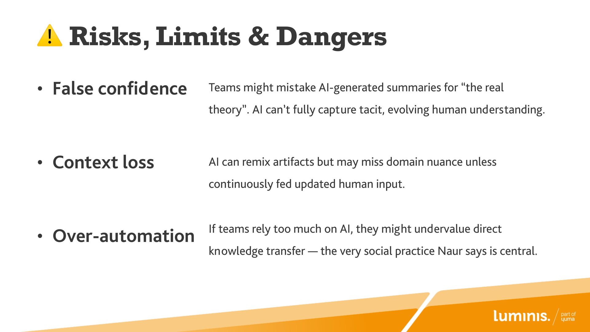loss • Over-automation Teams might mistake AI-generated summaries for “the real theory”. AI can’t fully capture tacit, evolving human understanding. AI can remix artifacts but may miss domain nuance unless continuously fed updated human input. If teams rely too much on AI, they might undervalue direct knowledge transfer — the very social practice Naur says is central.