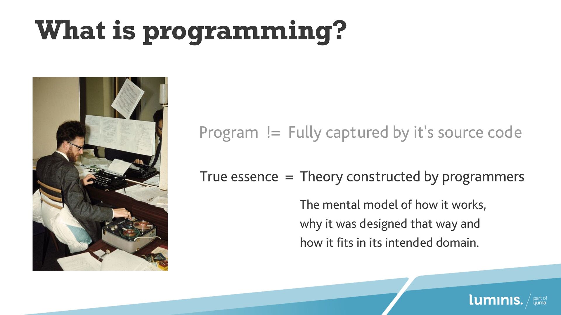 code True essence = Theory constructed by programmers The mental model of how it works, why it was designed that way and how it fits in its intended domain.