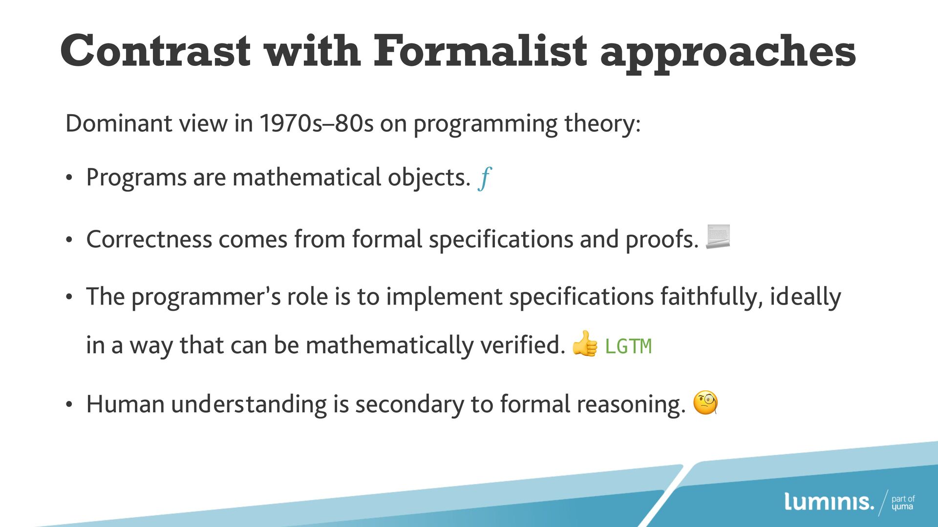 theory: • Programs are mathematical objects. 𝑓 • Correctness comes from formal specifications and proofs. $ • The programmer’s role is to implement specifications faithfully, ideally in a way that can be mathematically verified. % LGTM • Human understanding is secondary to formal reasoning. &