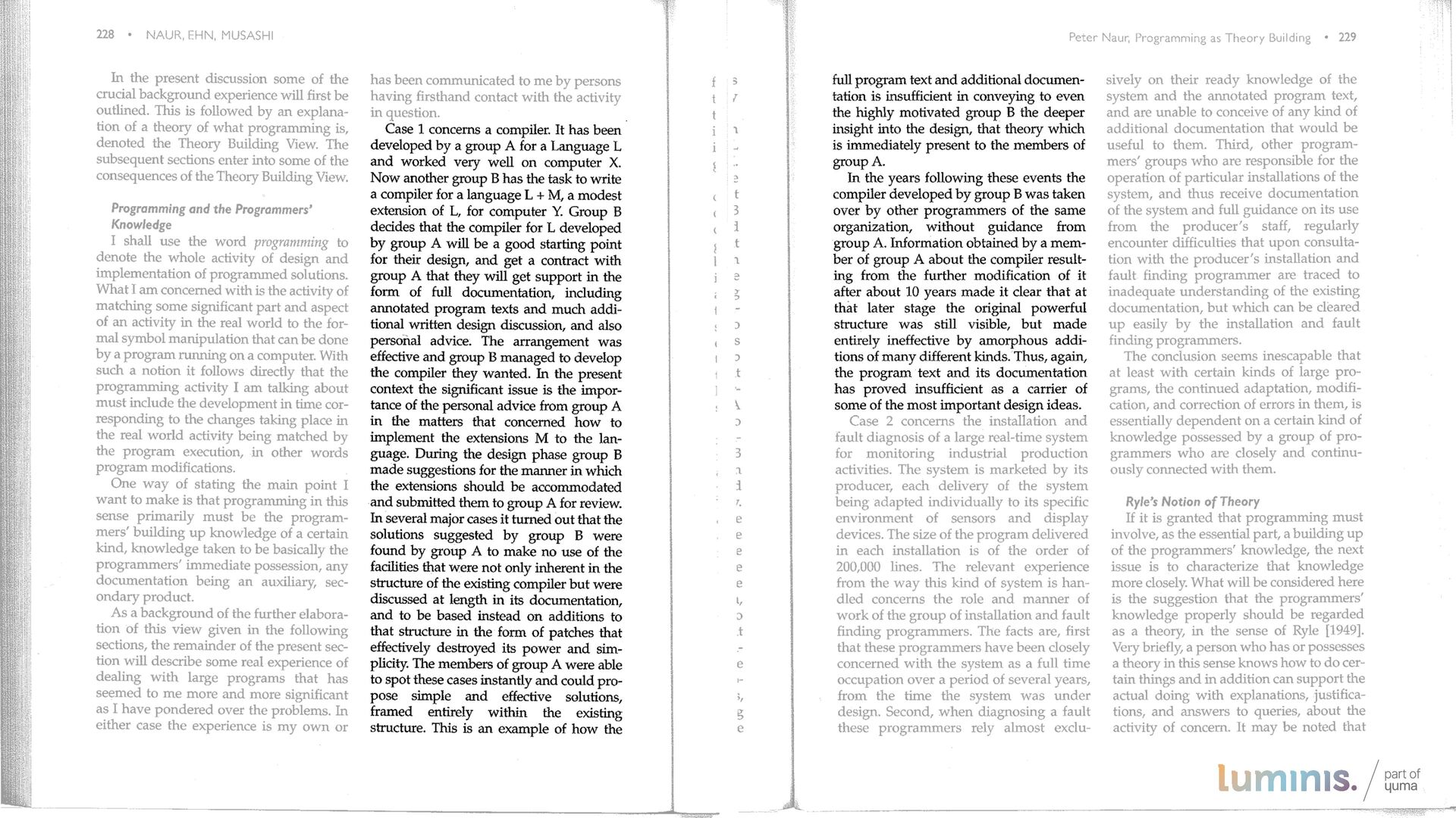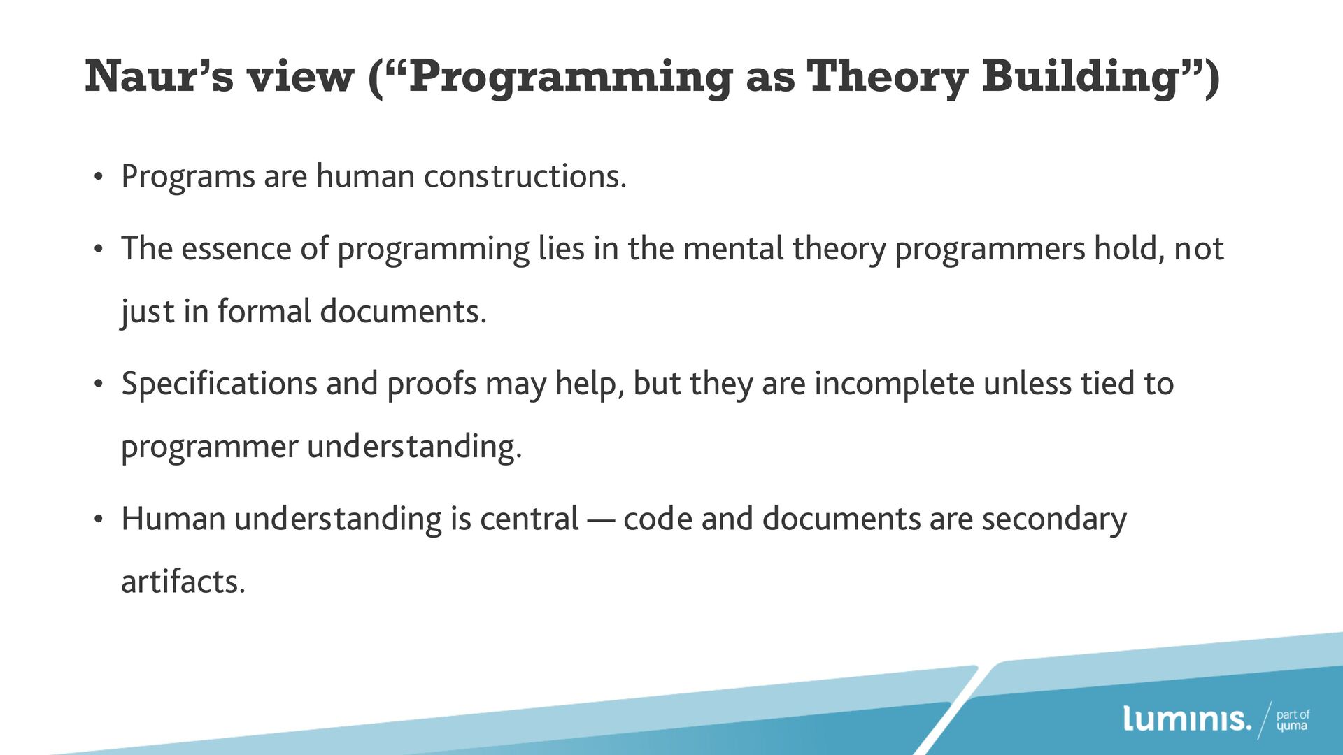 constructions. • The essence of programming lies in the mental theory programmers hold, not just in formal documents. • Specifications and proofs may help, but they are incomplete unless tied to programmer understanding. • Human understanding is central — code and documents are secondary artifacts.