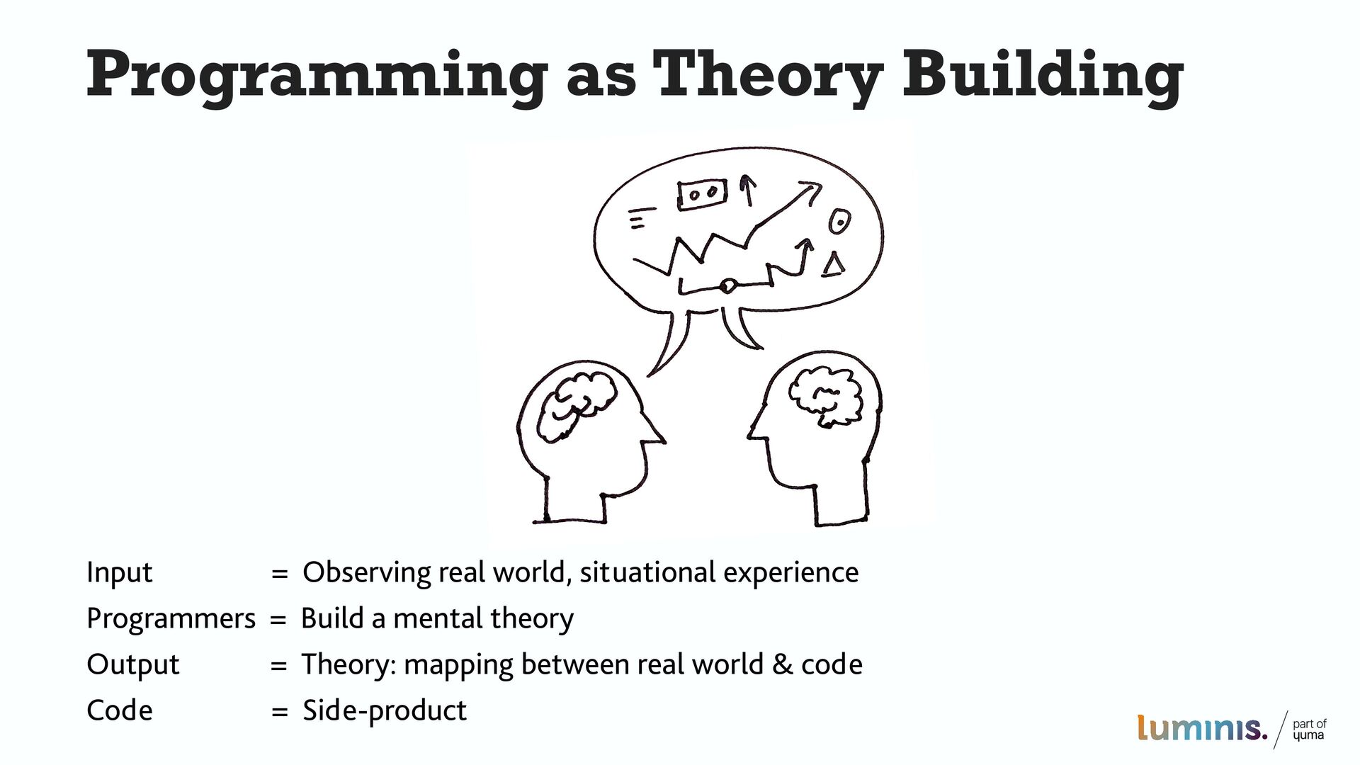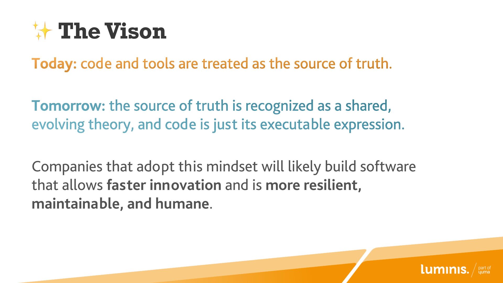 the source of truth. Tomorrow: the source of truth is recognized as a shared, evolving theory, and code is just its executable expression. Companies that adopt this mindset will likely build software that allows faster innovation and is more resilient, maintainable, and humane.