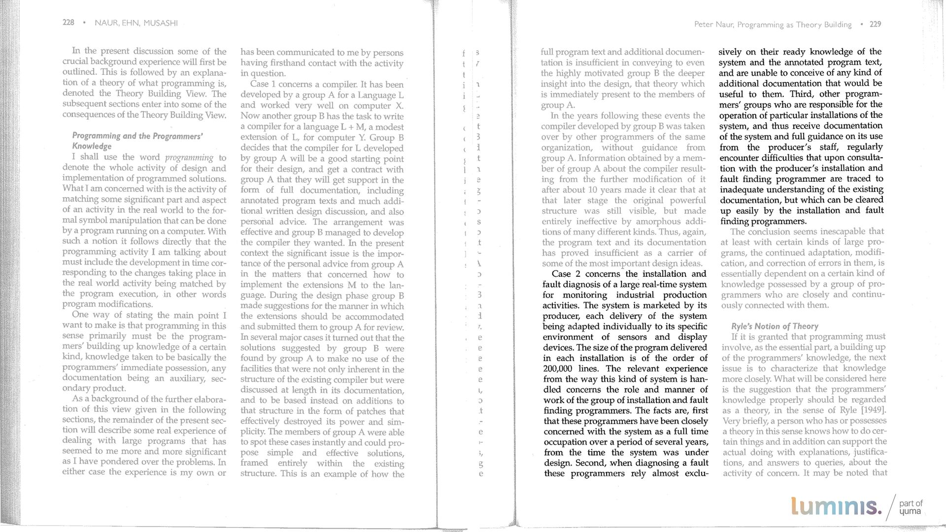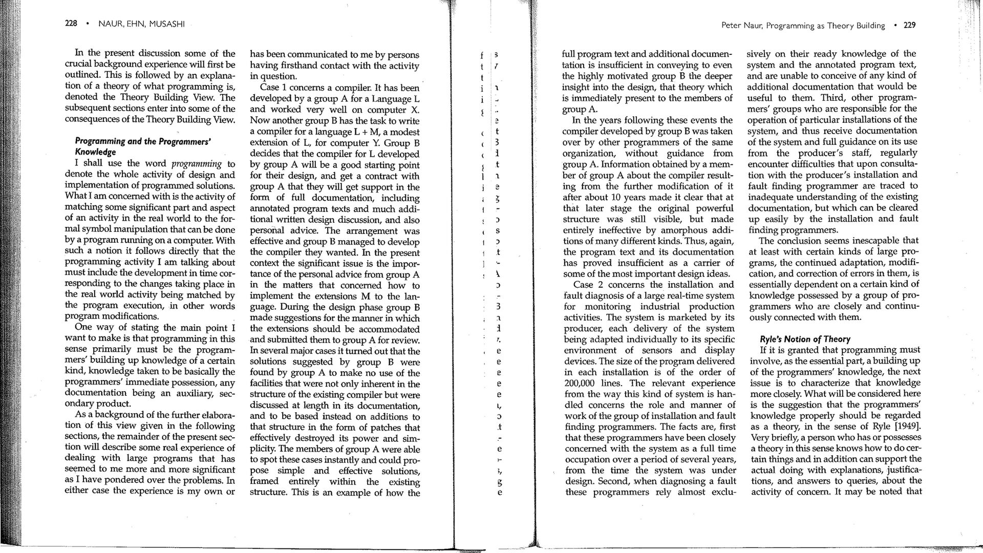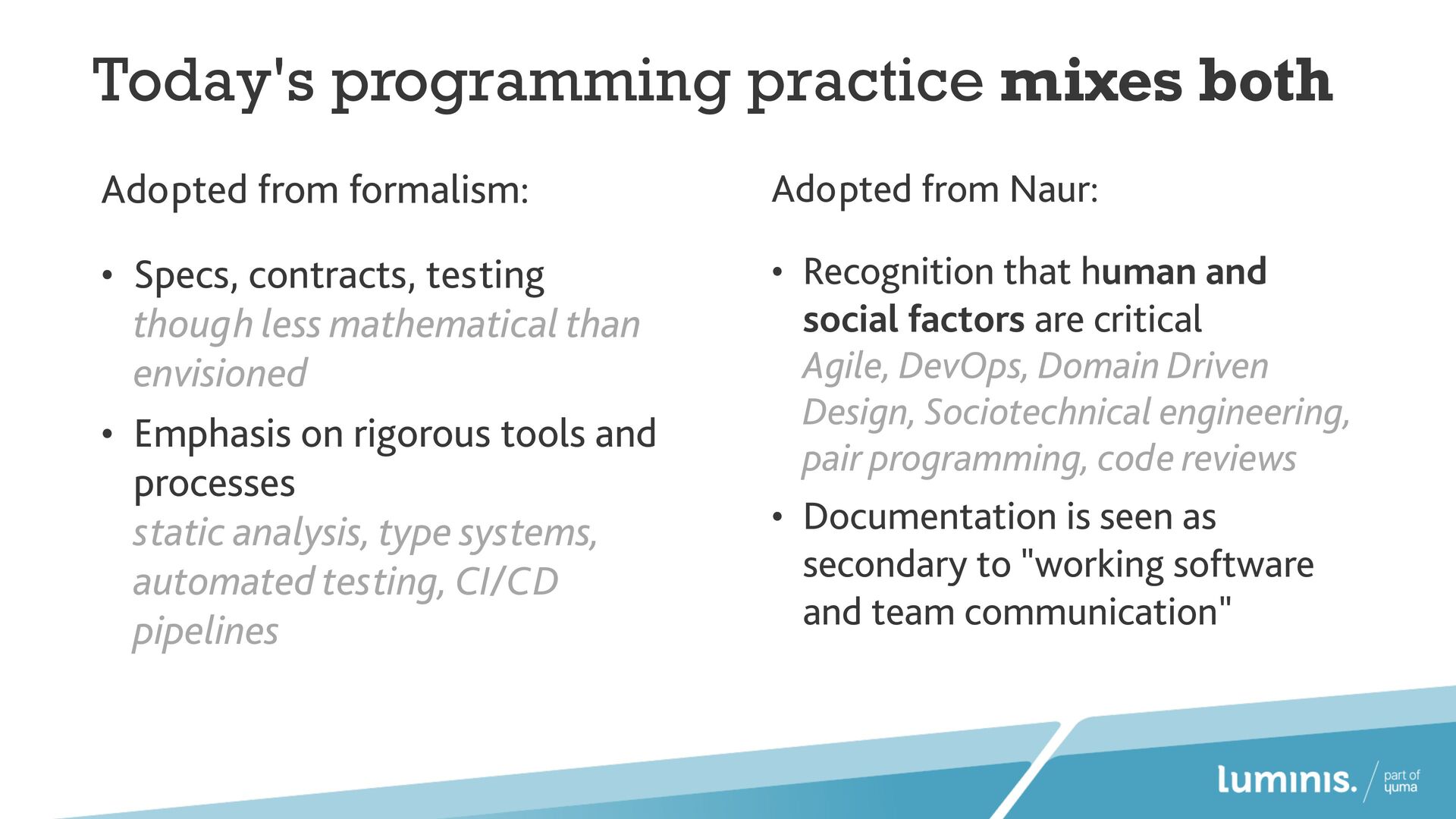 contracts, testing though less mathematical than envisioned • Emphasis on rigorous tools and processes static analysis, type systems, automated testing, CI/CD pipelines Adopted from Naur: • Recognition that human and social factors are critical Agile, DevOps, Domain Driven Design, Sociotechnical engineering, pair programming, code reviews • Documentation is seen as secondary to "working software and team communication"
