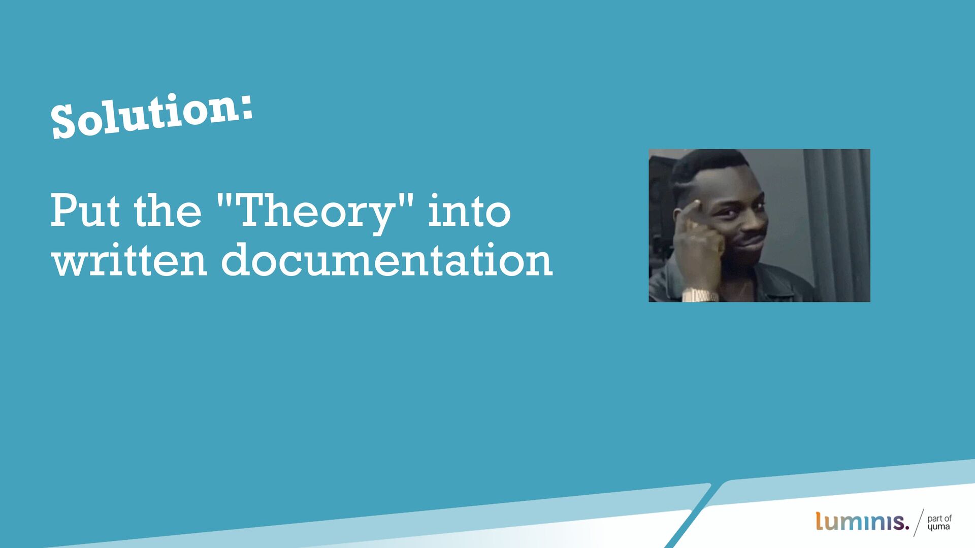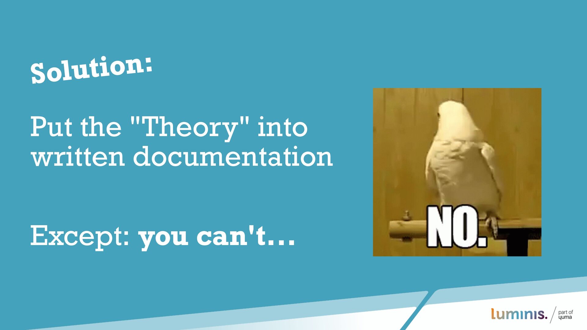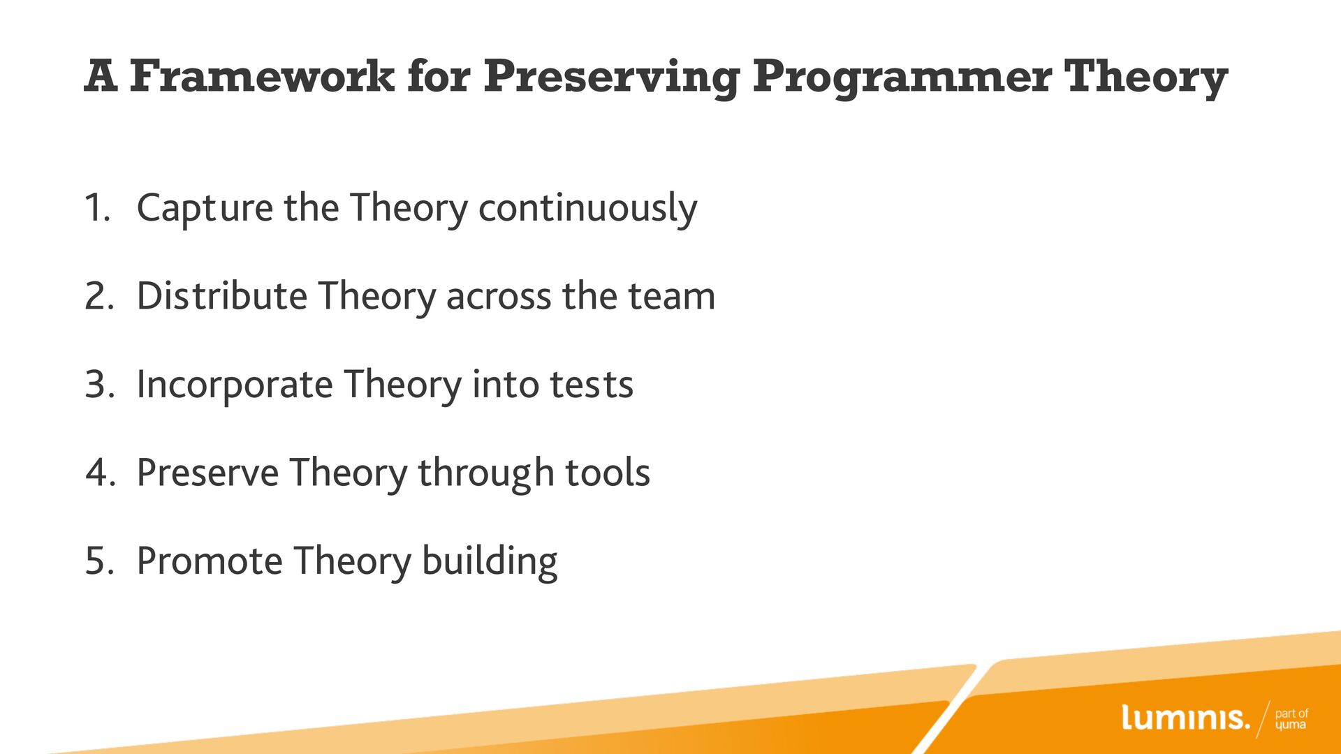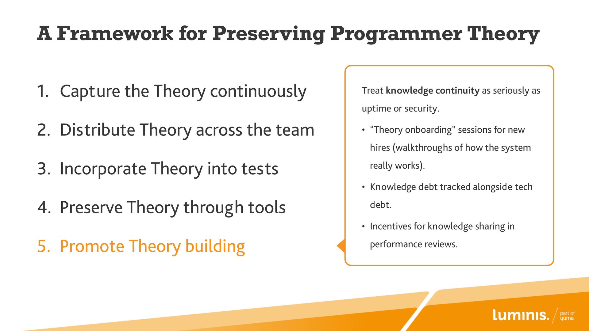 continuously 2. Distribute Theory across the team 3. Incorporate Theory into tests 4. Preserve Theory through tools 5. Promote Theory building Treat knowledge continuity as seriously as uptime or security. • “Theory onboarding” sessions for new hires (walkthroughs of how the system really works). • Knowledge debt tracked alongside tech debt. • Incentives for knowledge sharing in performance reviews.