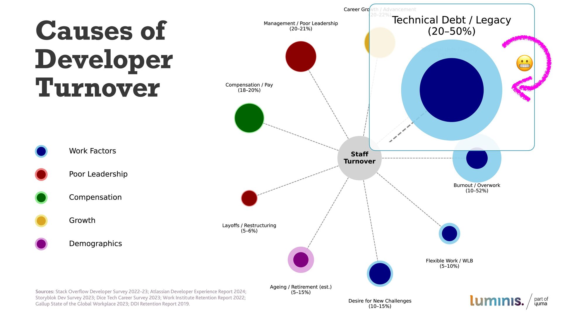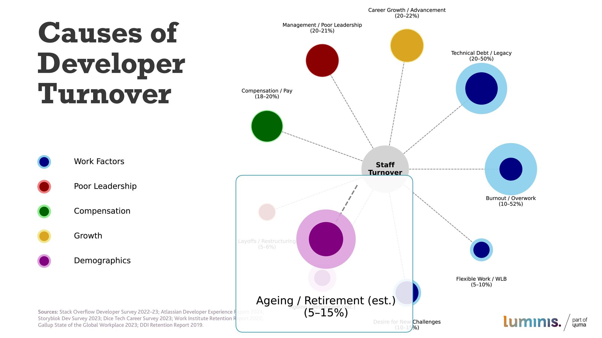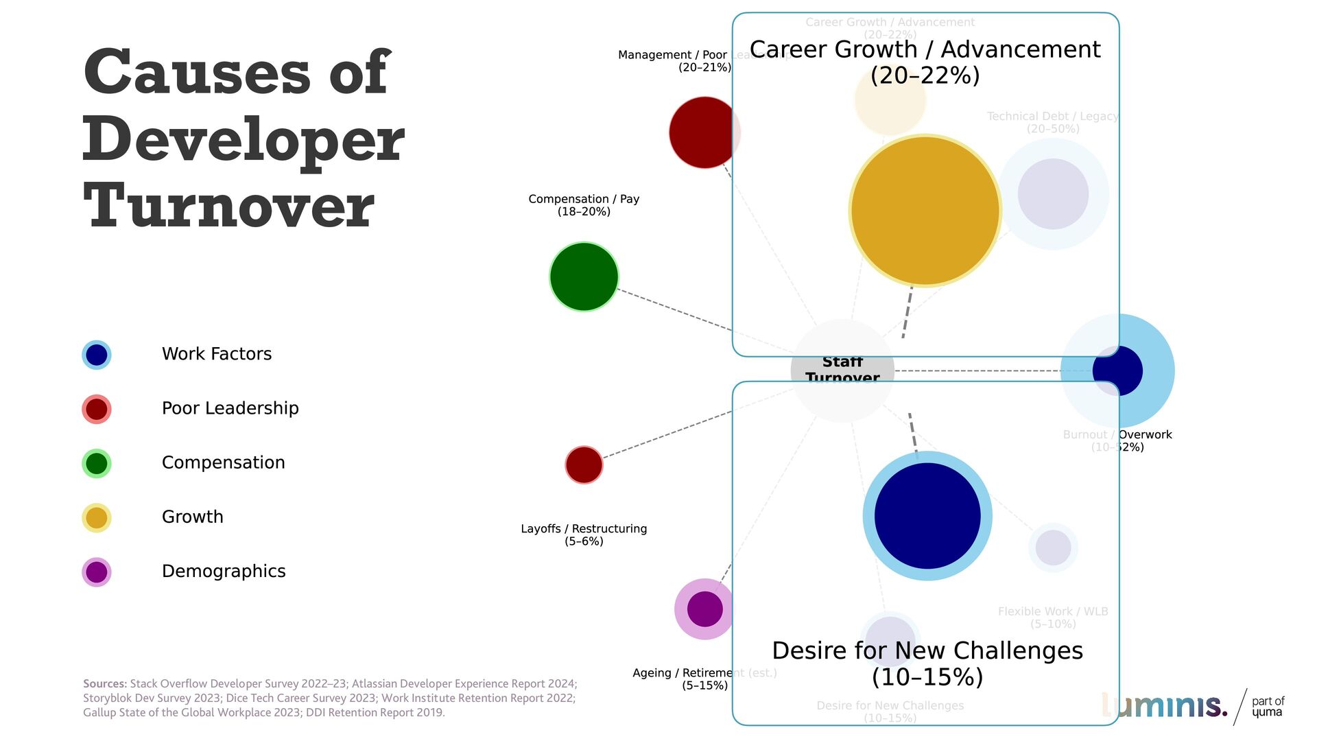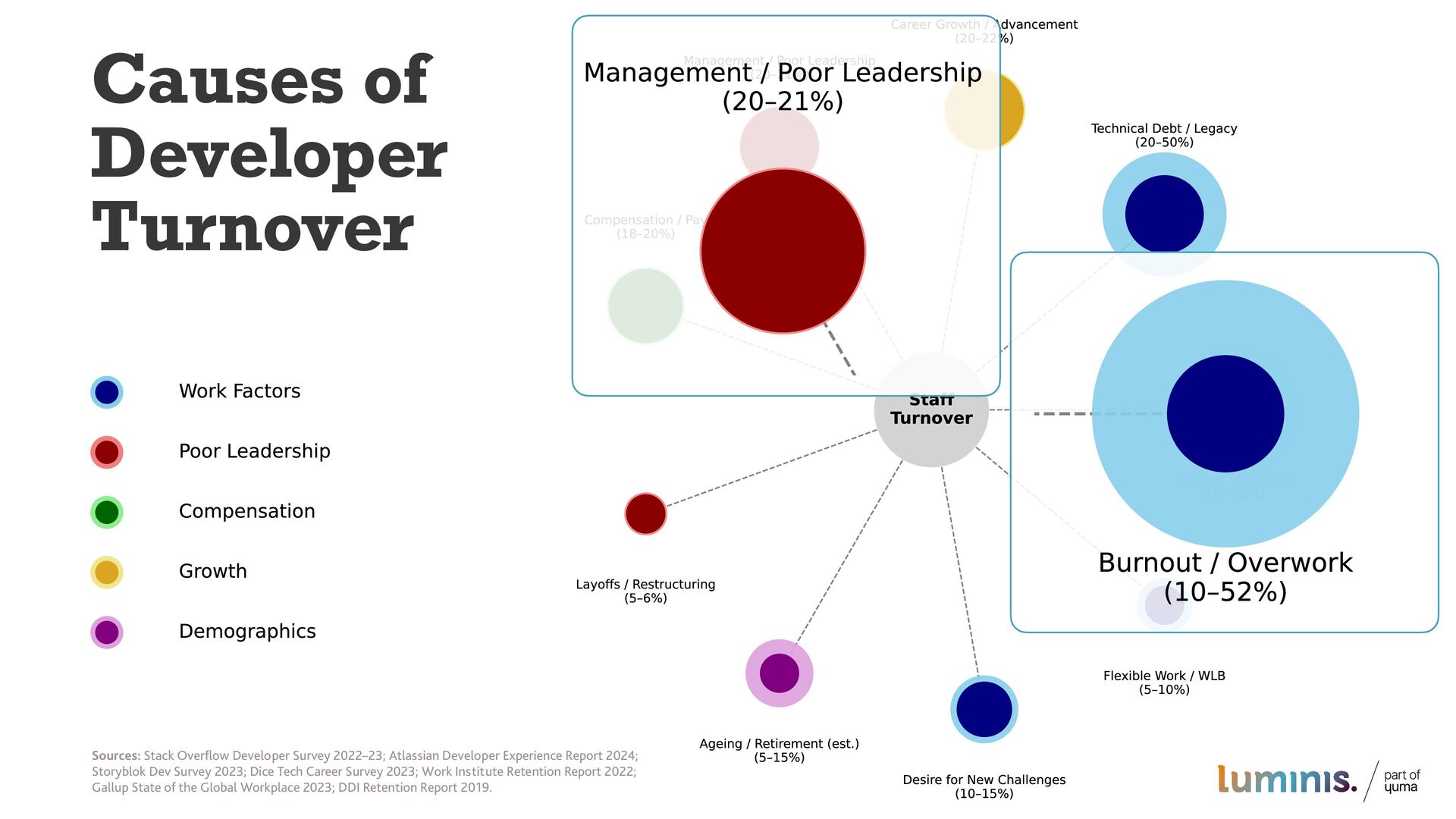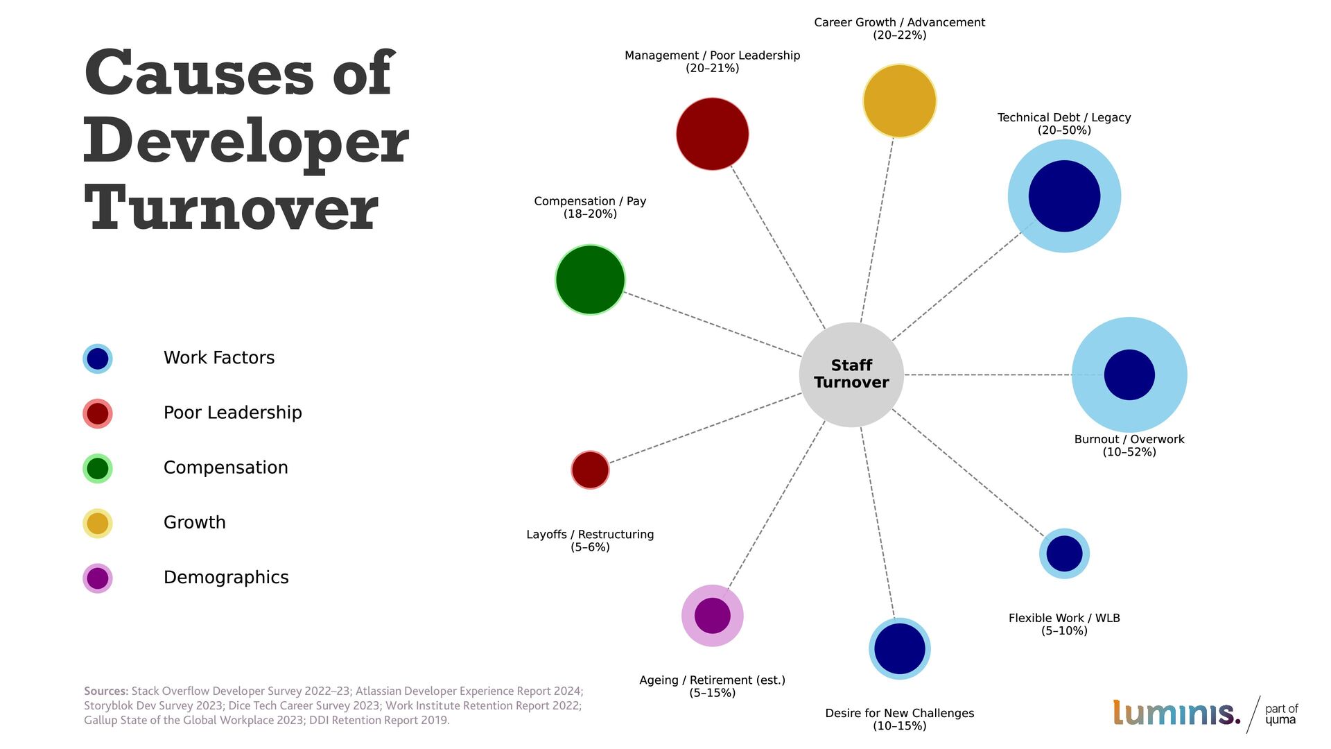 Atlassian Developer Experience Report 2024; Storyblok Dev Survey 2023; Dice Tech Career Survey 2023; Work Institute Retention Report 2022; Gallup State of the Global Workplace 2023; DDI Retention Report 2019. !