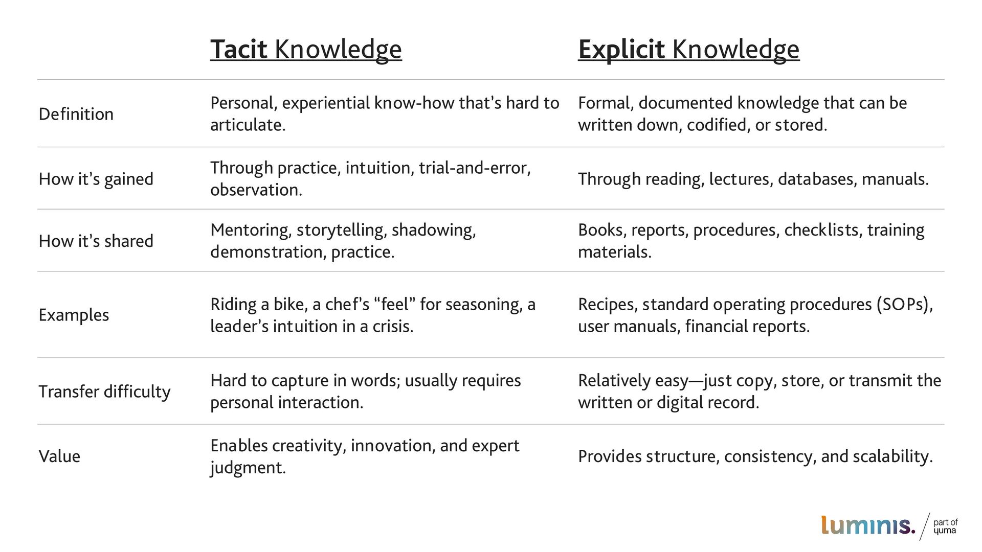 to articulate. Formal, documented knowledge that can be written down, codified, or stored. How it’s gained Through practice, intuition, trial-and-error, observation. Through reading, lectures, databases, manuals. How it’s shared Mentoring, storytelling, shadowing, demonstration, practice. Books, reports, procedures, checklists, training materials. Examples Riding a bike, a chef’s “feel” for seasoning, a leader’s intuition in a crisis. Recipes, standard operating procedures (SOPs), user manuals, financial reports. Transfer difficulty Hard to capture in words; usually requires personal interaction. Relatively easy—just copy, store, or transmit the written or digital record. Value Enables creativity, innovation, and expert judgment. Provides structure, consistency, and scalability.