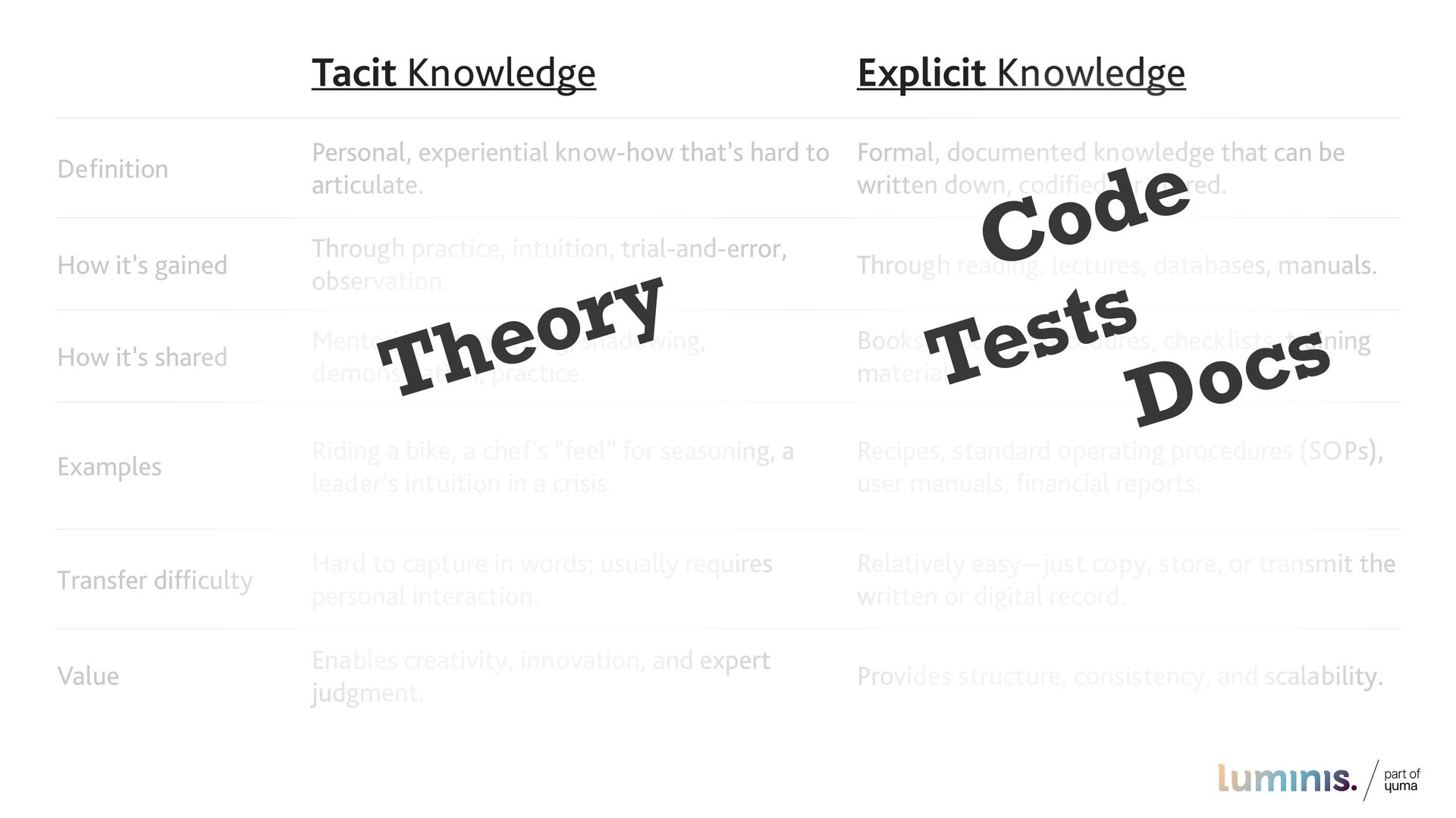 to articulate. Formal, documented knowledge that can be written down, codified, or stored. How it’s gained Through practice, intuition, trial-and-error, observation. Through reading, lectures, databases, manuals. How it’s shared Mentoring, storytelling, shadowing, demonstration, practice. Books, reports, procedures, checklists, training materials. Examples Riding a bike, a chef’s “feel” for seasoning, a leader’s intuition in a crisis. Recipes, standard operating procedures (SOPs), user manuals, financial reports. Transfer difficulty Hard to capture in words; usually requires personal interaction. Relatively easy—just copy, store, or transmit the written or digital record. Value Enables creativity, innovation, and expert judgment. Provides structure, consistency, and scalability. Code Docs Tests Theory