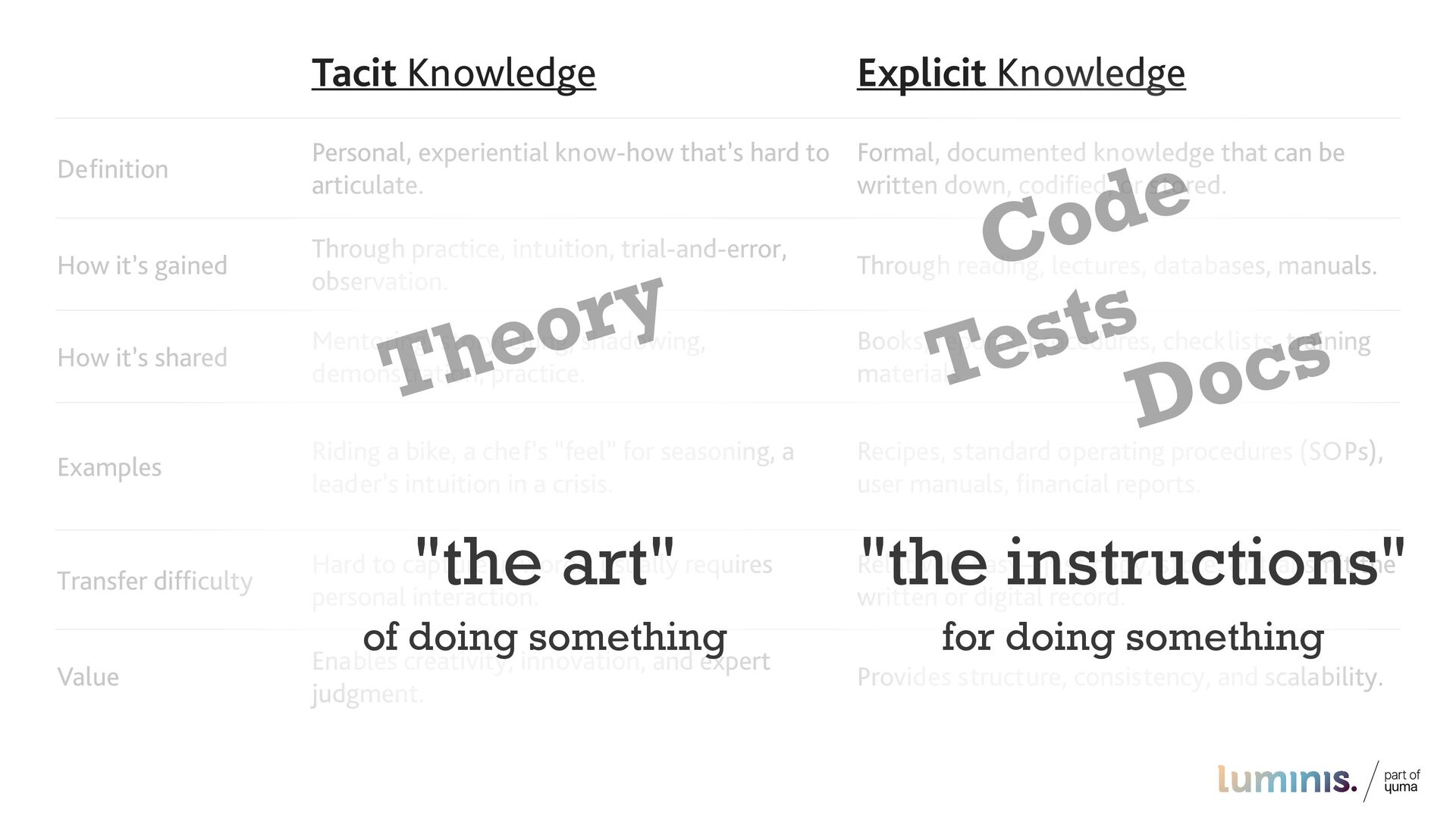 to articulate. Formal, documented knowledge that can be written down, codified, or stored. How it’s gained Through practice, intuition, trial-and-error, observation. Through reading, lectures, databases, manuals. How it’s shared Mentoring, storytelling, shadowing, demonstration, practice. Books, reports, procedures, checklists, training materials. Examples Riding a bike, a chef’s “feel” for seasoning, a leader’s intuition in a crisis. Recipes, standard operating procedures (SOPs), user manuals, financial reports. Transfer difficulty Hard to capture in words; usually requires personal interaction. Relatively easy—just copy, store, or transmit the written or digital record. Value Enables creativity, innovation, and expert judgment. Provides structure, consistency, and scalability. Theory Code "the art" of doing something Docs Tests "the instructions" for doing something