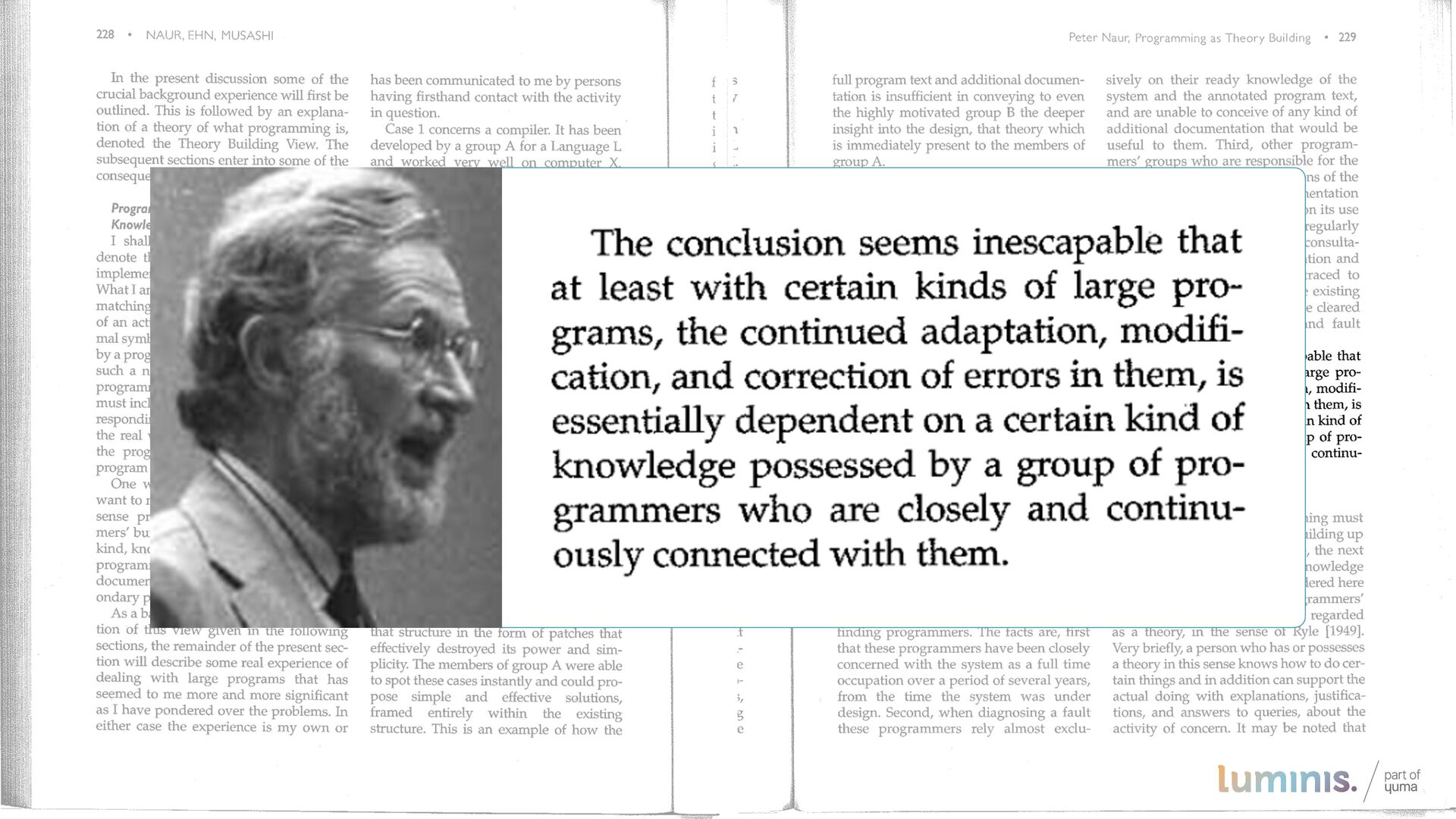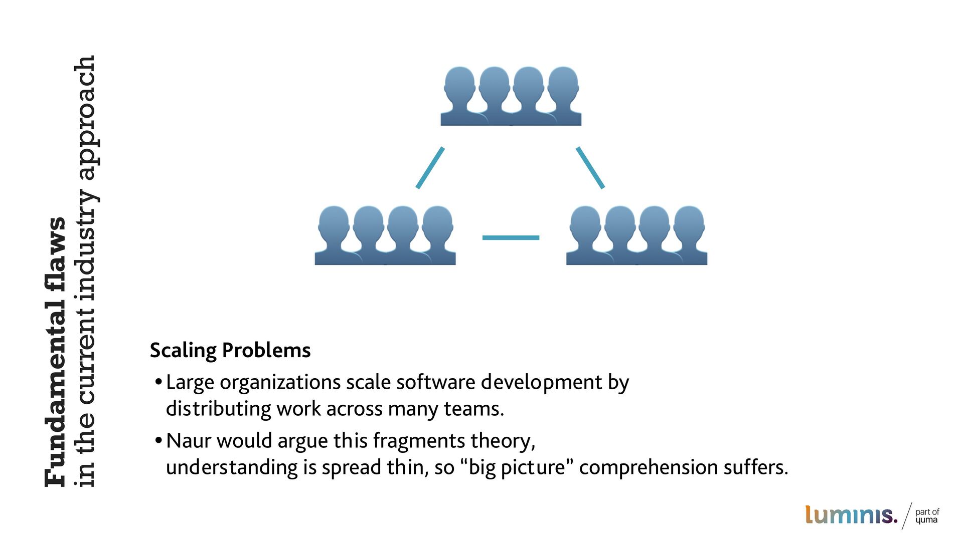 work across many teams. • Naur would argue this fragments theory, understanding is spread thin, so “big picture” comprehension suffers. Fundamental flaws in the current industry approach / / / / / /