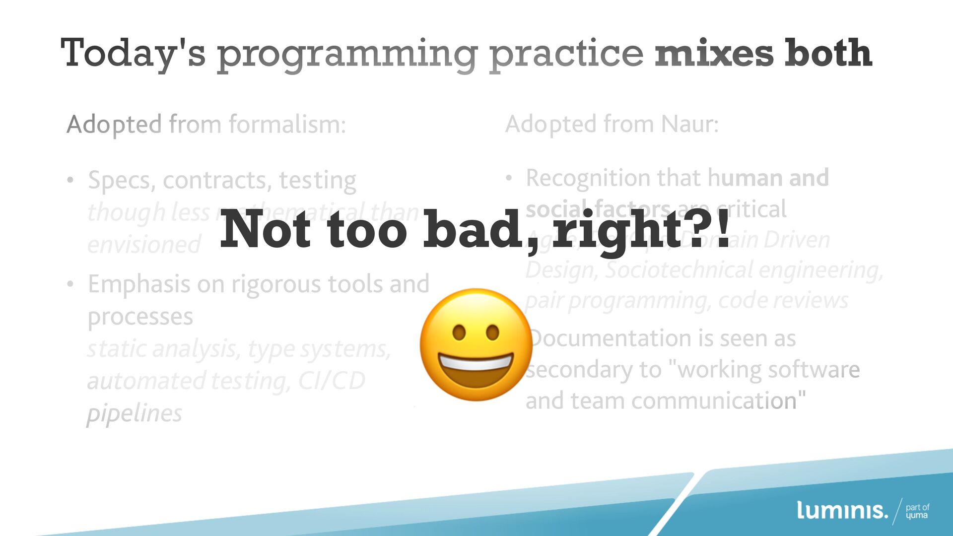 contracts, testing though less mathematical than envisioned • Emphasis on rigorous tools and processes static analysis, type systems, automated testing, CI/CD pipelines Adopted from Naur: • Recognition that human and social factors are critical Agile, DevOps, Domain Driven Design, Sociotechnical engineering, pair programming, code reviews • Documentation is seen as secondary to "working software and team communication" Not too bad, right?! (