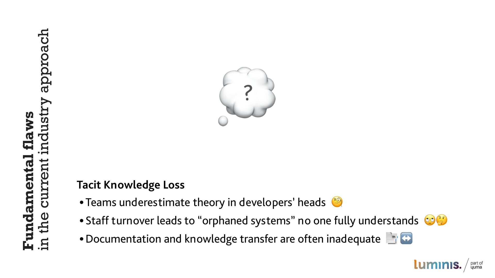 •Staff turnover leads to “orphaned systems” no one fully understands )* •Documentation and knowledge transfer are often inadequate + ↔ Fundamental flaws in the current industry approach - ?