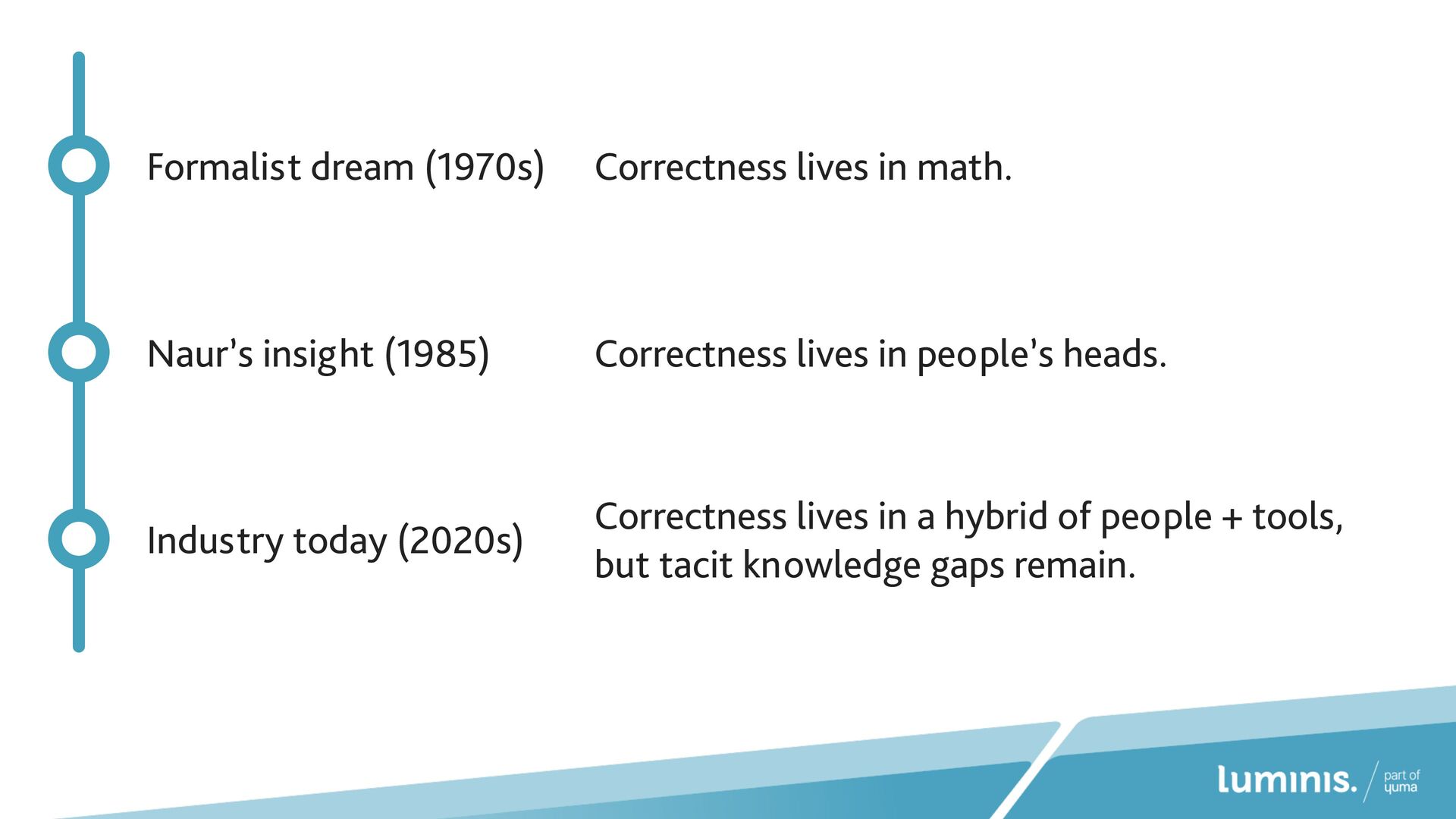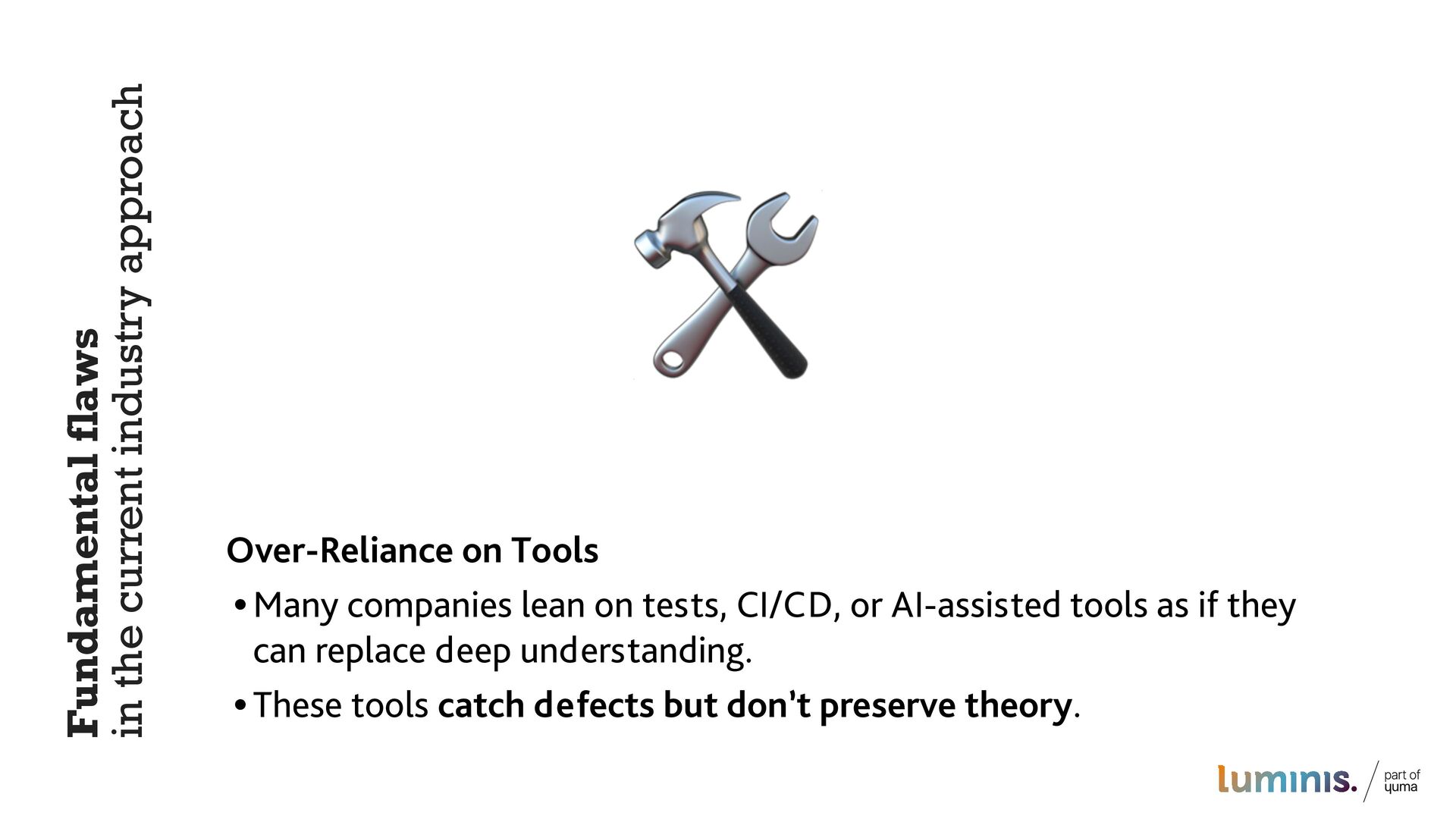 AI-assisted tools as if they can replace deep understanding. •These tools catch defects but don’t preserve theory. Fundamental flaws in the current industry approach .