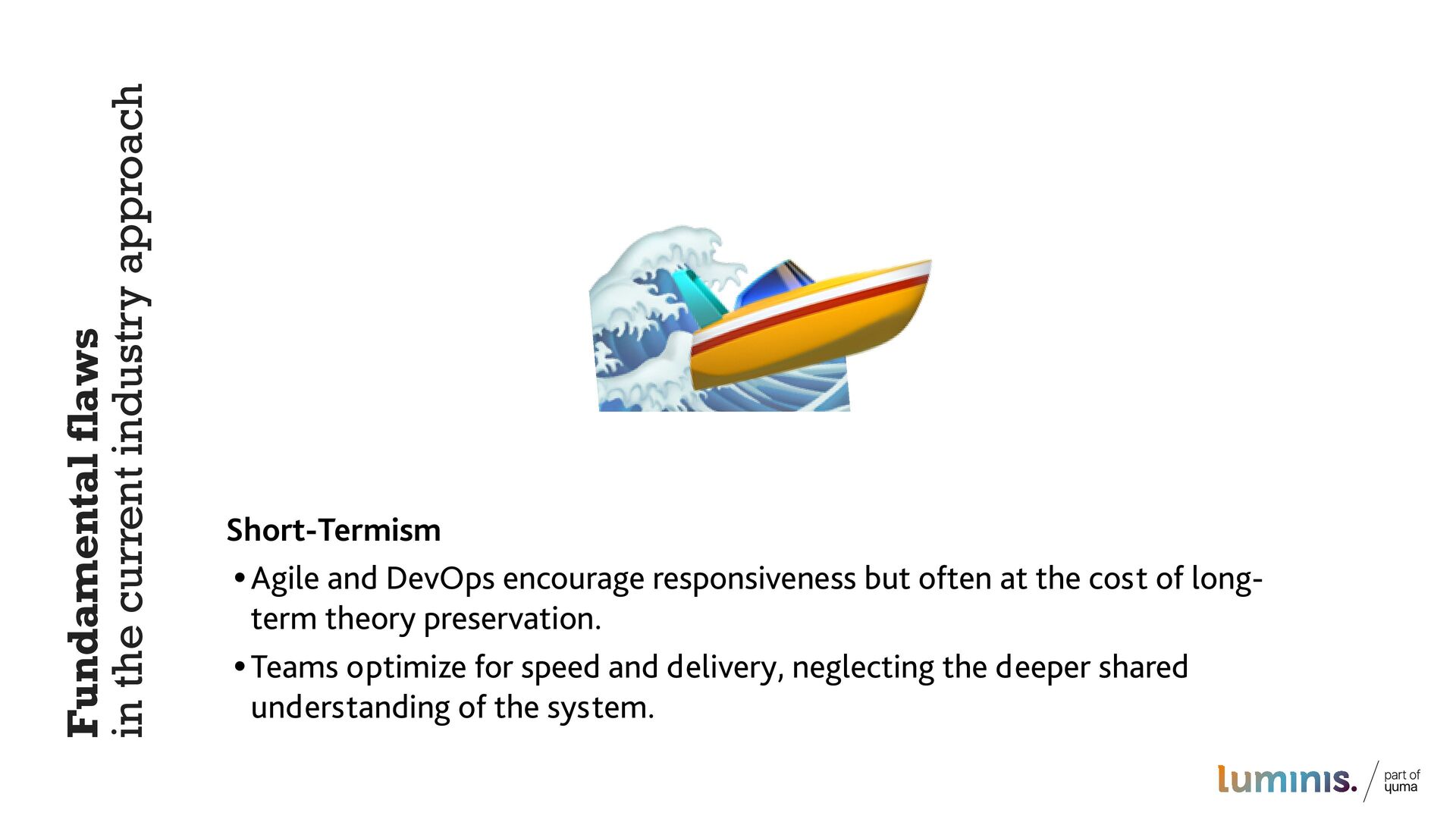 the cost of long- term theory preservation. • Teams optimize for speed and delivery, neglecting the deeper shared understanding of the system. Fundamental flaws in the current industry approach 1 0