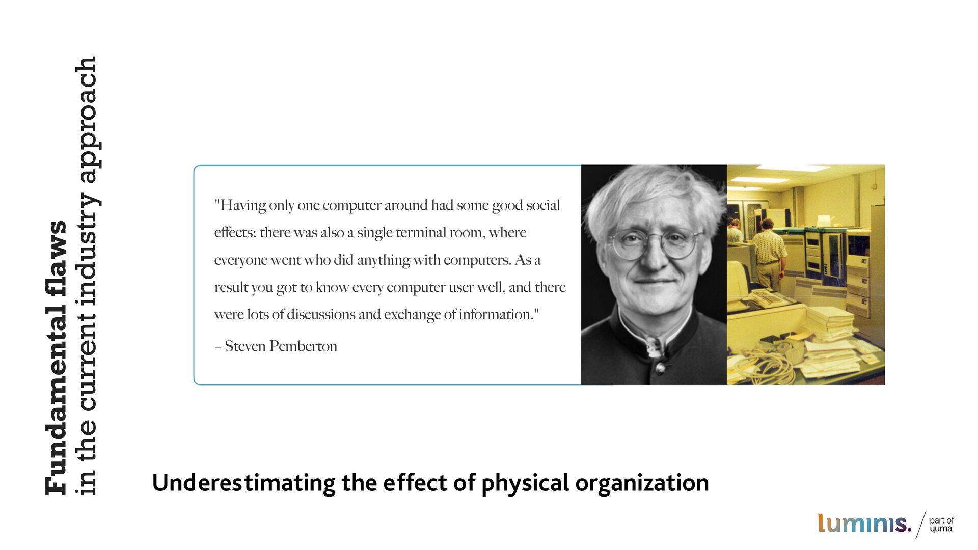computer around had some good social effects: there was also a single terminal room, where everyone went who did anything with computers. As a result you got to know every computer user well, and there were lots of discussions and exchange of information." – Steven Pemberton Underestimating the effect of physical organization