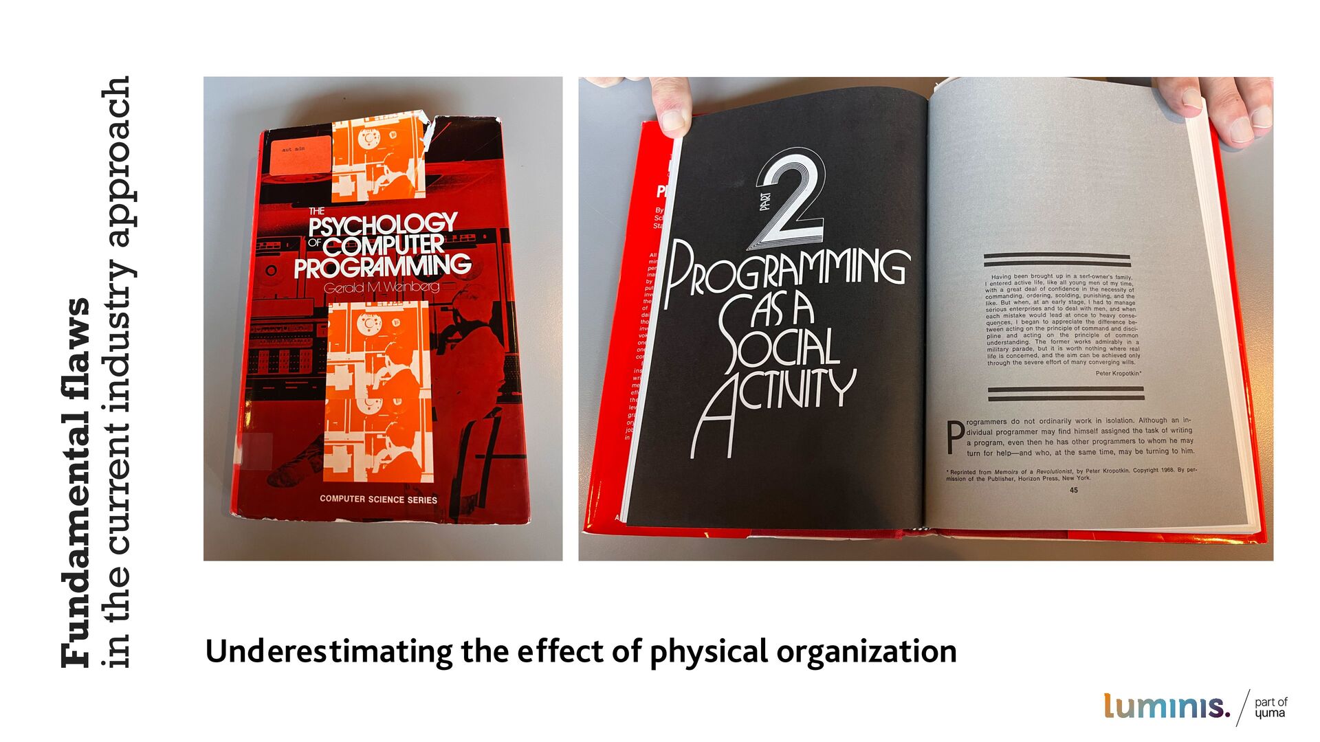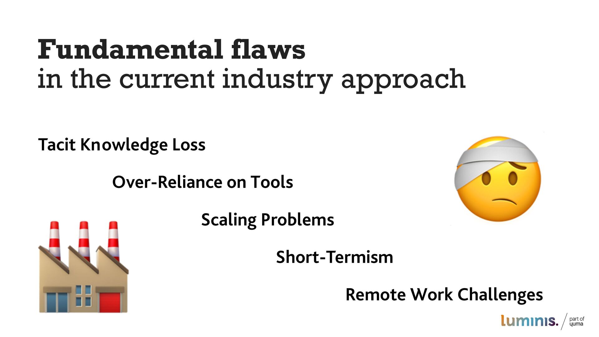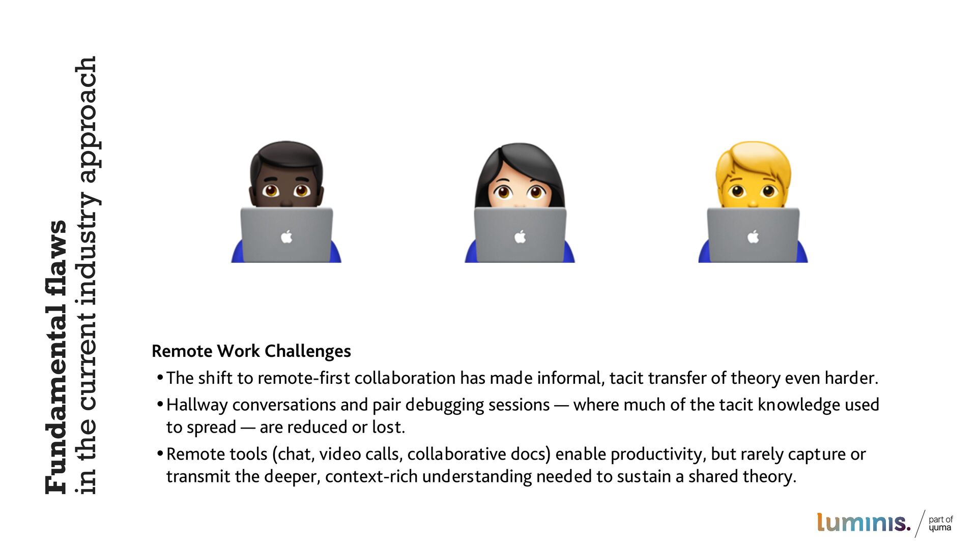 made informal, tacit transfer of theory even harder. • Hallway conversations and pair debugging sessions — where much of the tacit knowledge used to spread — are reduced or lost. • Remote tools (chat, video calls, collaborative docs) enable productivity, but rarely capture or transmit the deeper, context-rich understanding needed to sustain a shared theory. Fundamental flaws in the current industry approach 2 3 4