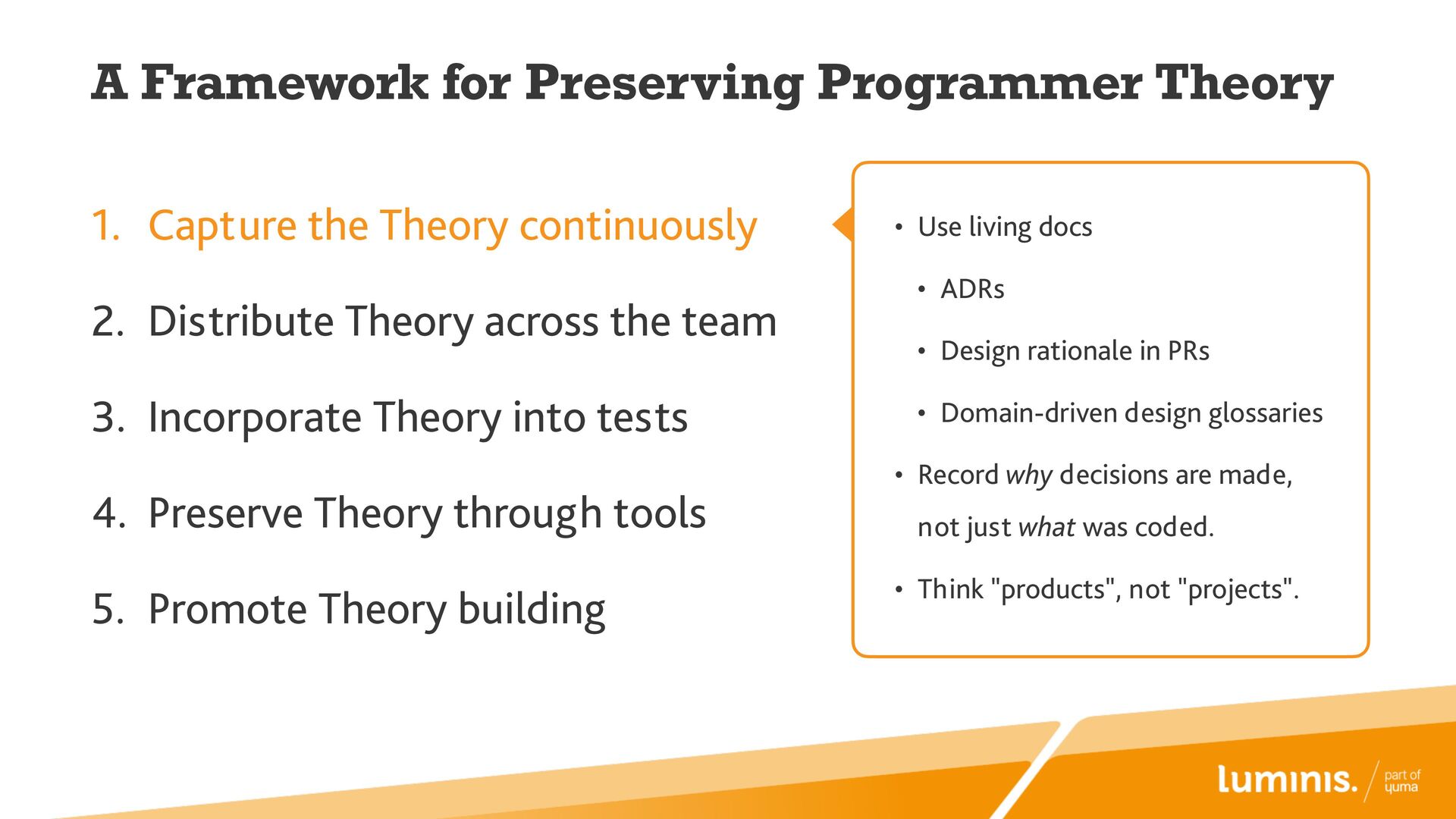 continuously 2. Distribute Theory across the team 3. Incorporate Theory into tests 4. Preserve Theory through tools 5. Promote Theory building • Use living docs • ADRs • Design rationale in PRs • Domain-driven design glossaries • Record why decisions are made, not just what was coded. • Think "products", not "projects".