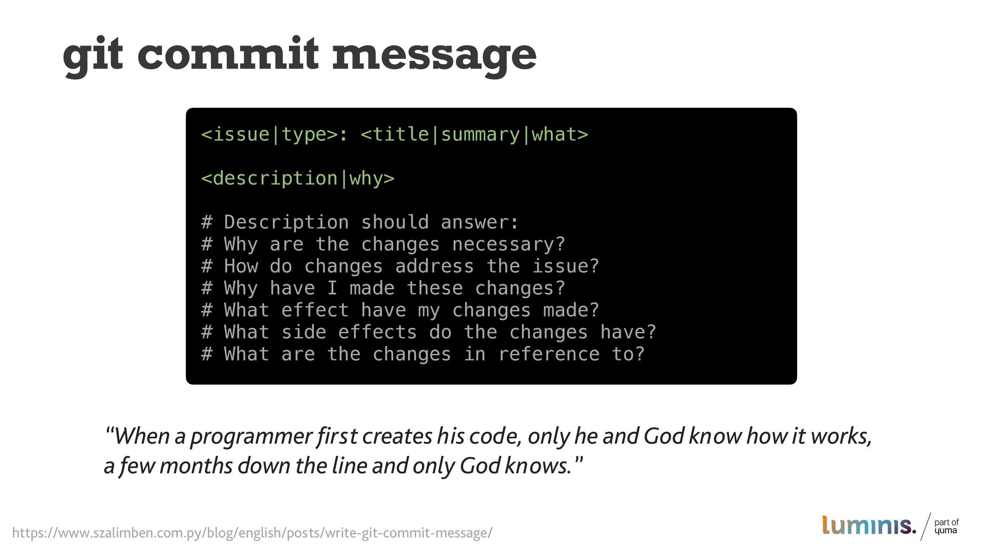 the changes necessary? # How do changes address the issue? # Why have I made these changes? # What effect have my changes made? # What side effects do the changes have? # What are the changes in reference to? “When a programmer first creates his code, only he and God know how it works, a few months down the line and only God knows.” https://www.szalimben.com.py/blog/english/posts/write-git-commit-message/ git commit message