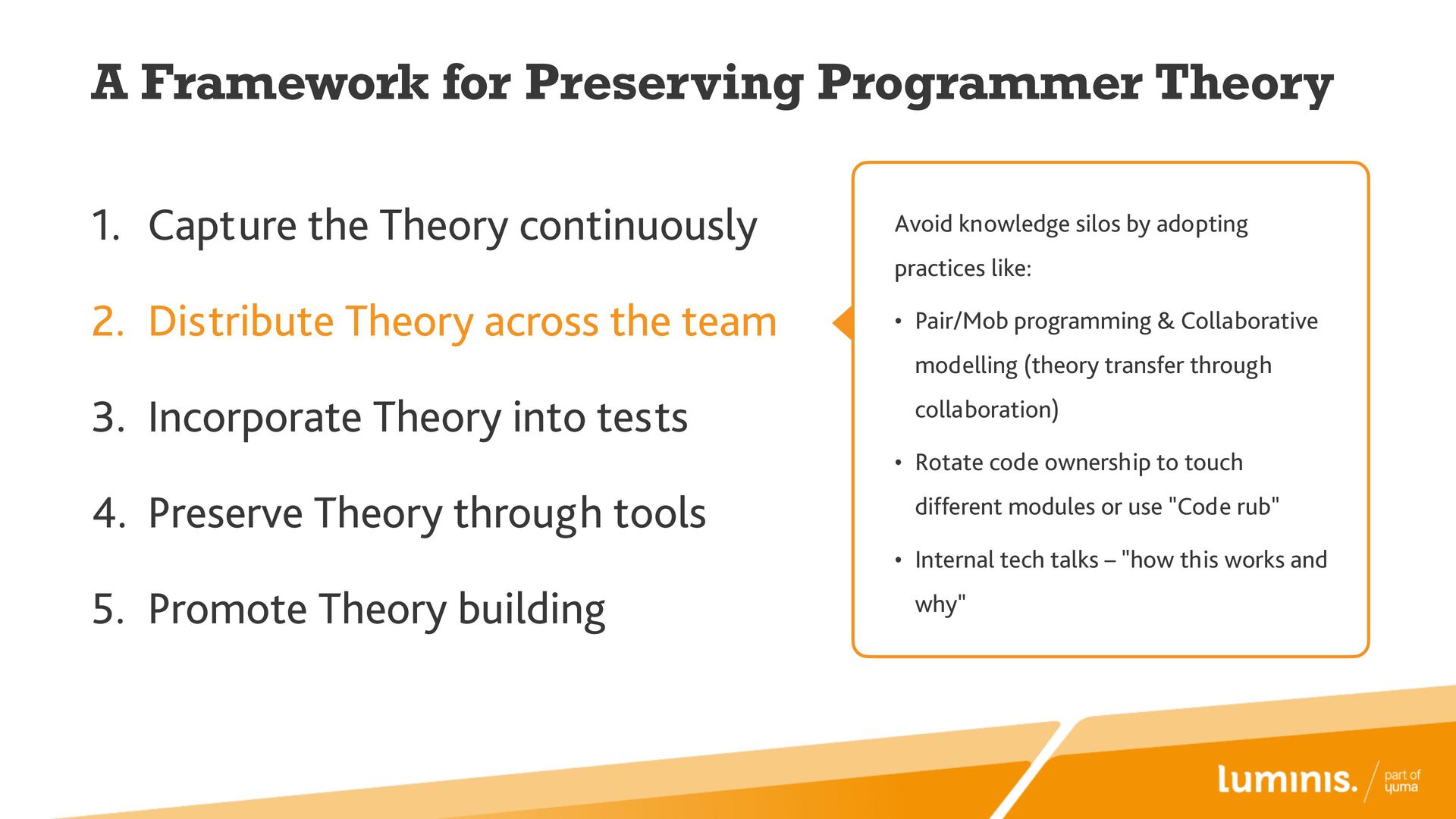 continuously 2. Distribute Theory across the team 3. Incorporate Theory into tests 4. Preserve Theory through tools 5. Promote Theory building Avoid knowledge silos by adopting practices like: • Pair/Mob programming & Collaborative modelling (theory transfer through collaboration) • Rotate code ownership to touch different modules or use "Code rub" • Internal tech talks – "how this works and why"