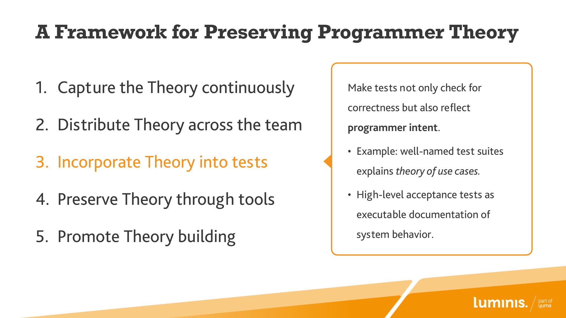 continuously 2. Distribute Theory across the team 3. Incorporate Theory into tests 4. Preserve Theory through tools 5. Promote Theory building Make tests not only check for correctness but also reflect programmer intent. • Example: well-named test suites explains theory of use cases. • High-level acceptance tests as executable documentation of system behavior.