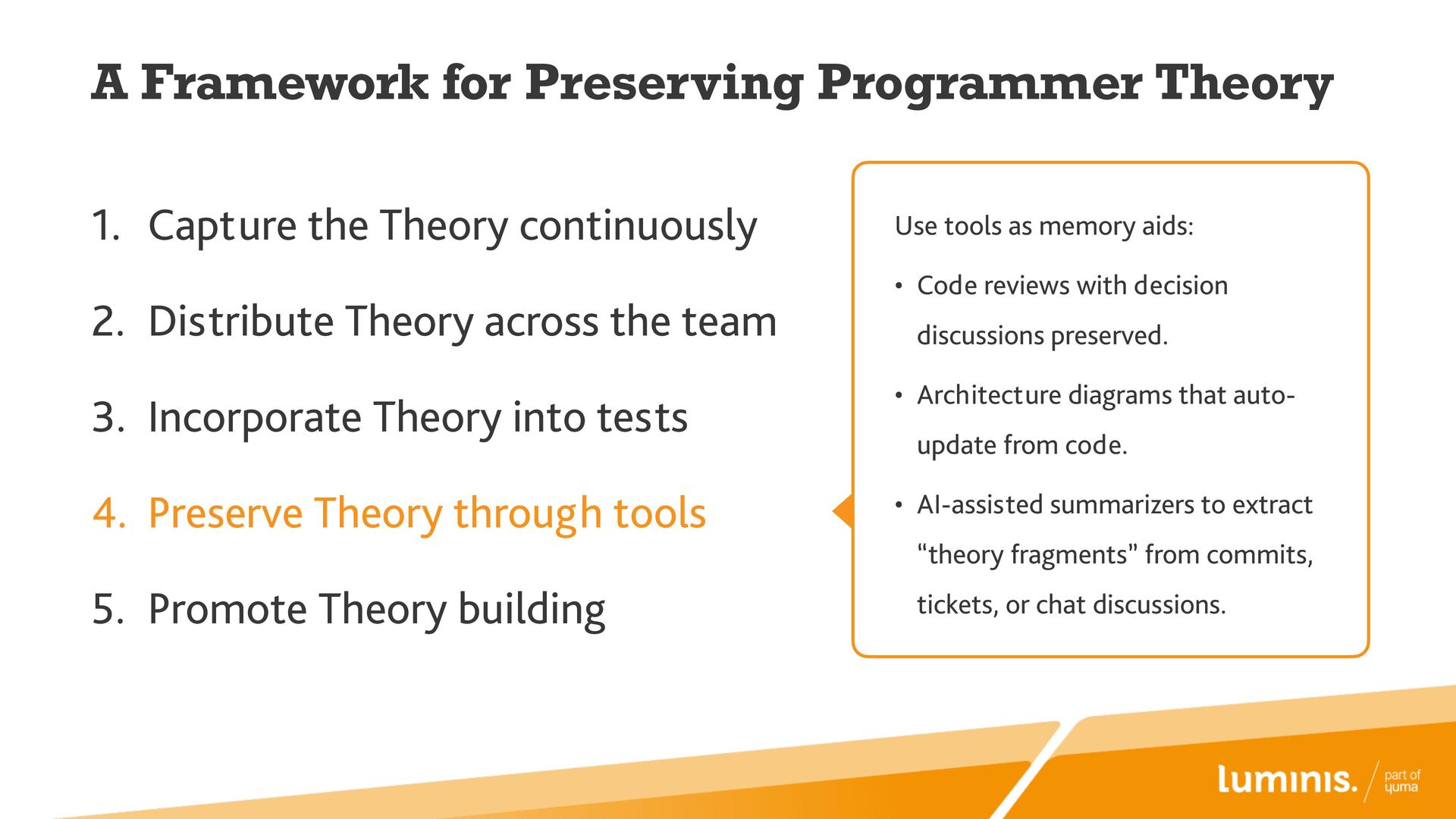 continuously 2. Distribute Theory across the team 3. Incorporate Theory into tests 4. Preserve Theory through tools 5. Promote Theory building Use tools as memory aids: • Code reviews with decision discussions preserved. • Architecture diagrams that auto- update from code. • AI-assisted summarizers to extract “theory fragments” from commits, tickets, or chat discussions.