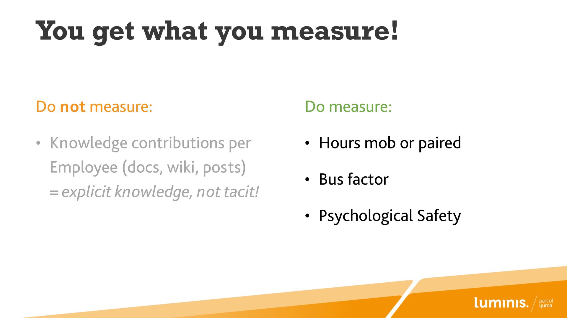 or paired • Bus factor • Psychological Safety Do not measure: • Knowledge contributions per Employee (docs, wiki, posts) = explicit knowledge, not tacit!