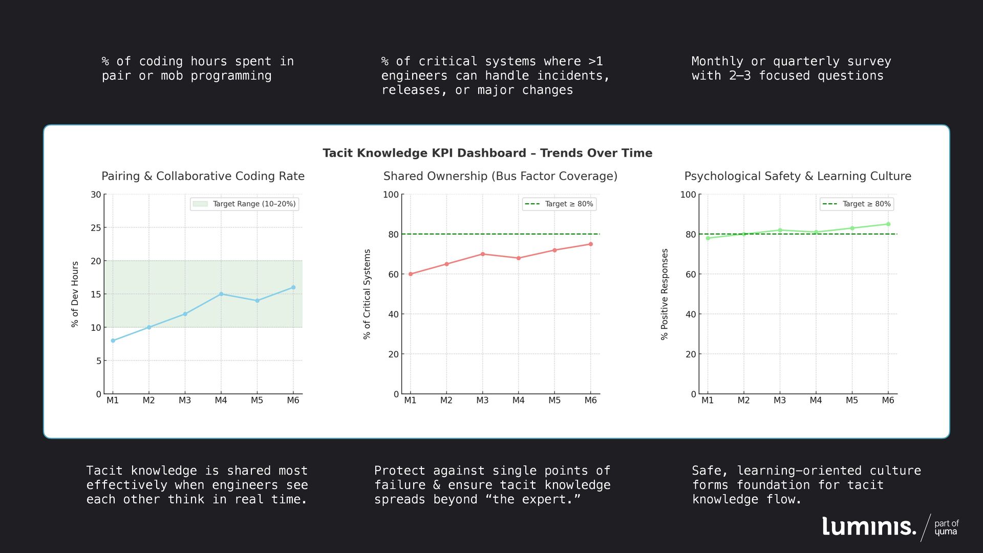 Protect against single points of failure & ensure tacit knowledge spreads beyond “the expert.” Tacit knowledge is shared most effectively when engineers see each other think in real time. % of critical systems where >1 engineers can handle incidents, releases, or major changes Monthly or quarterly survey with 2–3 focused questions Safe, learning-oriented culture forms foundation for tacit knowledge flow.
